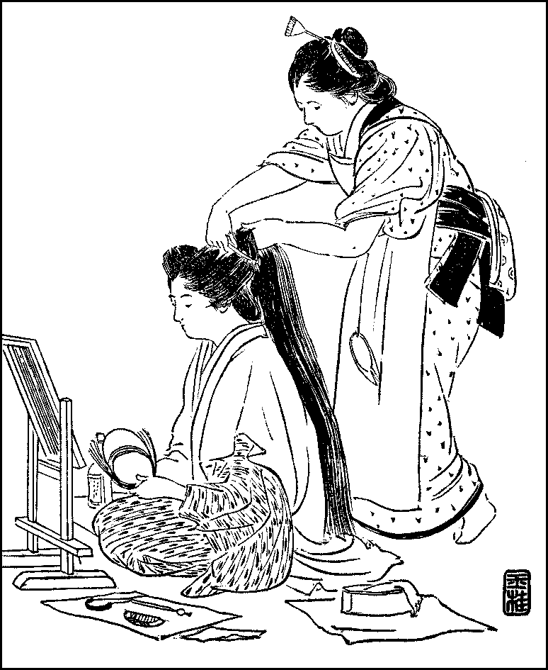 Queues—Hair-cutting—Moustaches and beards—Shaving—Women’s coiffure—Children’s hair—“Inverted maidenhair”—Shimada—“Rounded chignon”—Other forms—The lightest coiffure—Bars—Combs—Ornaments round the chignon—Hair-pins—The hair-dresser—The kind of hair esteemed—Lots of complexion—Girls painted—Women’s paint—Blackening of teeth—Shaving of eyebrows—Washing the face—Looking-glasses.