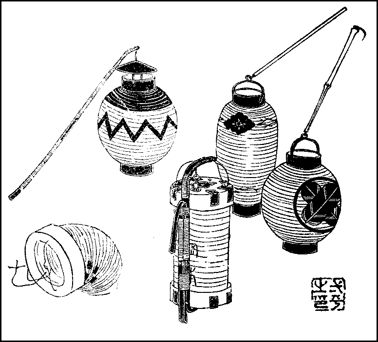 On the seventh of July took place the Feast of Tanabata, which is now seldom observed in Tokyo. On this night, according to the legend, the only one in the whole year when the Weaver (the star Vega) can meet her lover the Cow-herd (the star Altair) on the other side of the Heavenly River, as the Milky Way is called, magpies come and spread their wings across the river to bring the lovers together. And this meeting is celebrated with various offerings. The sixteenth of the month is, like the same day in January, the holiday for apprentices and servants. About this time, midsummer presents are exchanged between friends and relatives; but the most important occurrence in the middle of the month is the Feast of Lanterns. On the thirteenth, preparations are made for welcoming the spirits of the dead. The family tomb is visited and washed, while at home the shrine is decorated with festoons of vermicelli, to which are attached ears of Italian millet and panicum frumentaceum, dried persimmons, and the fruit of the torreya nucifera, and the lower part of the shrine is enclosed with a little fence of cryptomeria. In the evening, hemp-reeds are burnt in an earthen pan in front of the porch to receive the spirits who are then believed to enter the dwelling. On the fourteenth, offerings are made at the shrine and a priest is often called in to recite prayers. On the evening of the fifteenth when the spirits conclude their visit, the hemp-reeds are again burnt to speed them; people light their pipes at the fire and smoke as a charm against diseases of the mouth and step over the embers to secure themselves against all ailments in the lower parts of the body.