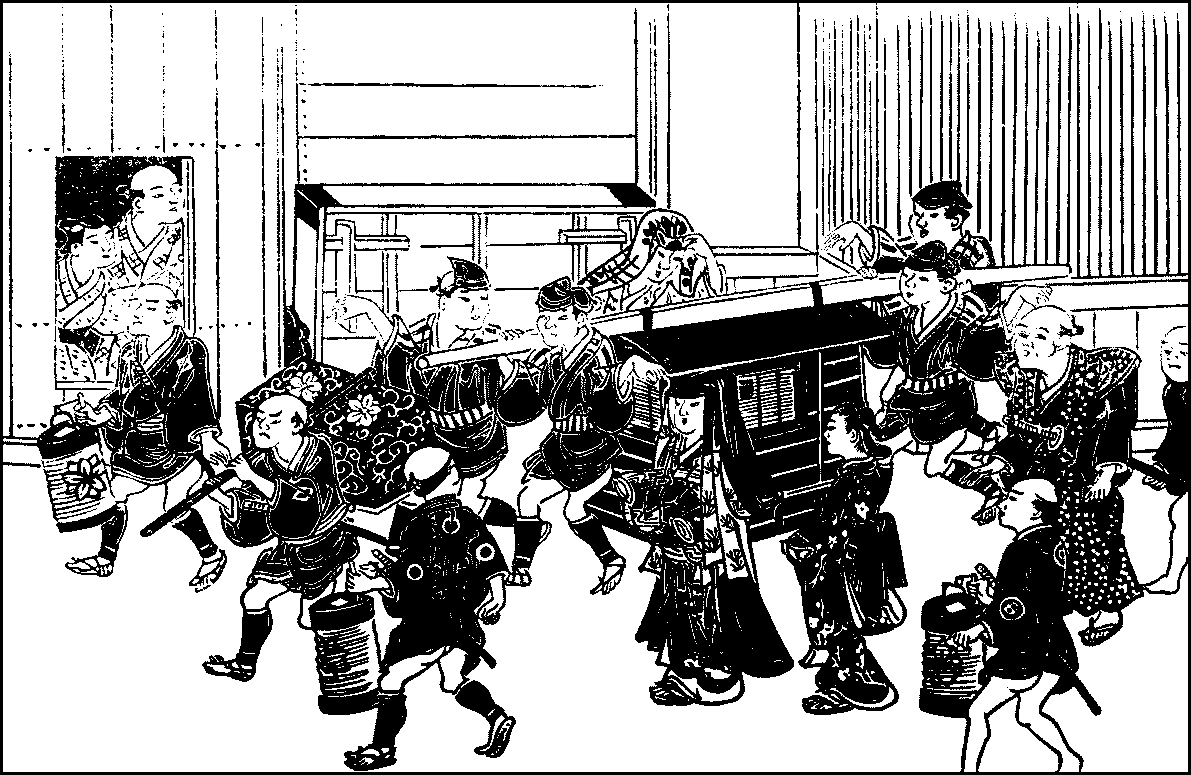 THERE are feasts and festivities galore in Tokyo. In the old times the feast-days marked in the calendar were far more numerous than they are now. In those days, while the daimyo and his retainers travelled pretty often between Yedo and their native province, the citizens seldom left town; it was a red-letter day with them when they set out on a pilgrimage to the great shrine of Ise or on a trip to Kyoto; and even these persons formed a very small minority. The high roads were infested by robbers; and it was only with their lives in their hands that humble citizens could go on a long journey. Being, then, confined in the town, its inhabitants naturally took what pleasures they could in it and availed themselves of every festivity to give themselves up to enjoyment. The festivals of the tutelary deities were, for instance, celebrated with great pomp; on annual feast-days the time-honoured customs were religiously observed; and the flowers of the season were admired and made occasions for general hilarity, for they served to break the monotony of a purely urban life. But the great facilities of transportation which have been introduced since the Restoration have in these days diminished the interest of the better classes in their city. The well-to-do men, who formerly considered it a luxury to possess a villa on the outskirts of Tokyo, are now not content unless they keep one at Kamakura or beyond for spending the week-end in and another a hundred miles or more from the city{288} for their summer retreat. Kamakura and Enoshima, which are only thirty miles away from Tokyo, were in the old days so distant that they would not think of visiting them unless they intended to spend a few days there; but now school-children are taken to those places on a day’s excursion. The ease with which men can leave the city has made them but lukewarm supporters of the institutions which gave the town its periodical gaiety; for they no longer take an active part in the local festivities or pride themselves upon the fine show their ward might make on such occasions. Even the flowers for which Tokyo is noted they go to look at in the country; and the festivals of the tutelary deities have lost their former splendour, and their most prominent feature, the procession-cars, cannot now be built on the grand scale of the old days, for unless they can be bent low, they cannot parade the streets without snapping the innumerable electric wires which disfigure the thoroughfares of the metropolis. Of the five great feasts which were held every year in former times, two are no longer celebrated in Tokyo, the Feast of Tanabata on the seventh day of the seventh month of the lunar calendar and the Feast of the Chrysanthemum on the ninth day of the ninth month, the remaining three being the New Year’s Day on the first day of the first month, the Feast of Dolls on the third day of the third month, and that of Flags on the fifth day of the fifth month.