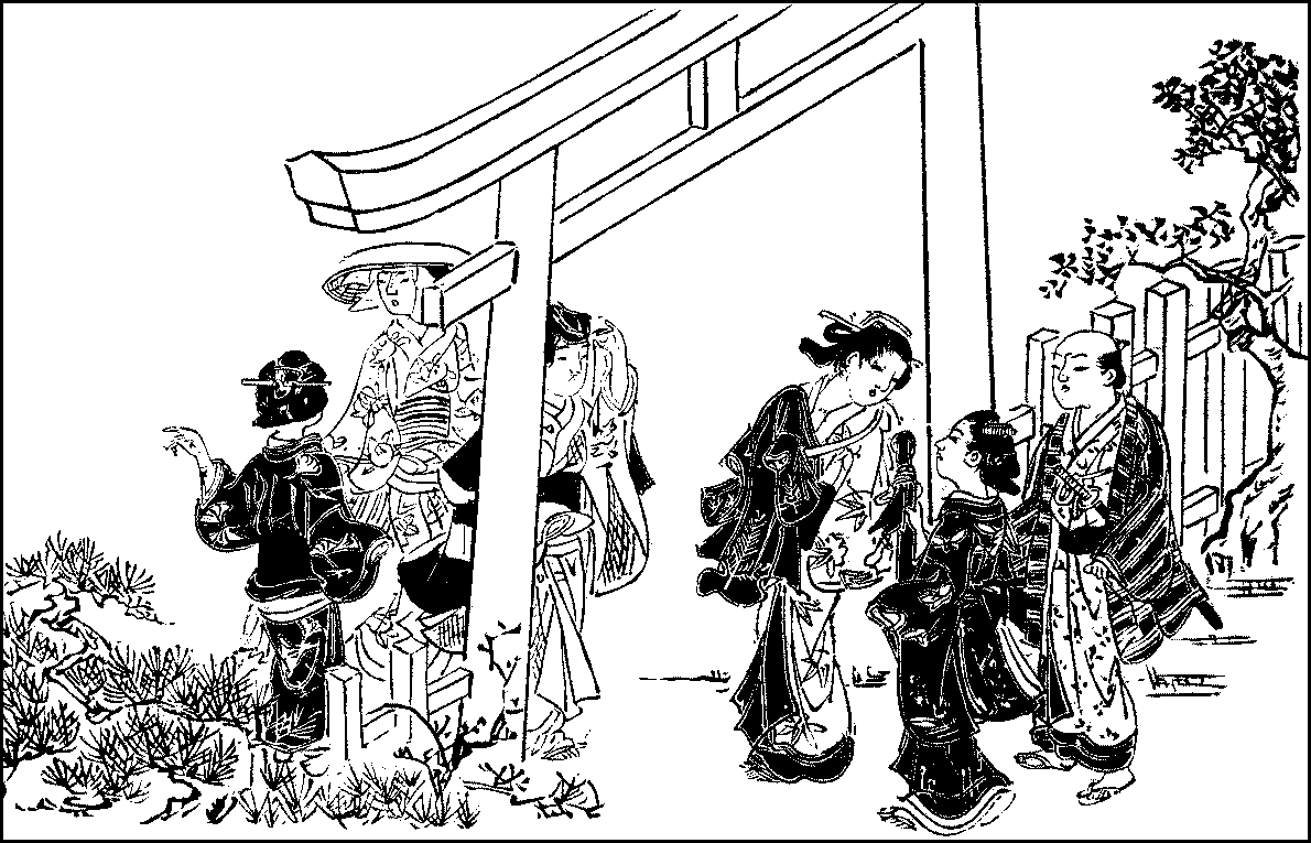 On the seventeenth of October, the newly-harvested rice is offered at the great Shrine of the Sun-Goddess in the province of Ise; and in a country where rice is the most important food, such an occasion is naturally celebrated as a national holiday. On the twentieth, the fête of Daikoku and Ebisu, the two gods of fortune, is celebrated in many merchants’ houses with a great feast to which friends and relatives are invited.