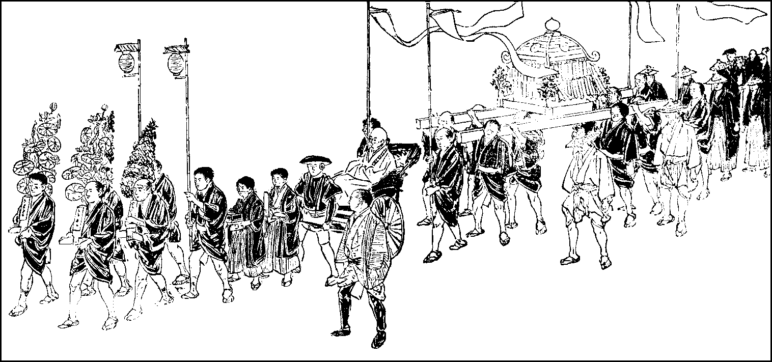 Early in June the irises and sweet-flags flower; there are gardens in Tokyo where these flowers are specially cultivated and shown to the public. June is also the month for the annual fêtes of many local deities. There are nearly fifty shrines where annual fêtes are{300} held in Tokyo; and the greatest of these are the Sanno and Kanda Myojin, whose fêtes were until lately among the famous sights of the city. The fête of the Sanno takes place on the fifteenth of June, while that of the Kanda Myojin is celebrated on the same day three months later.