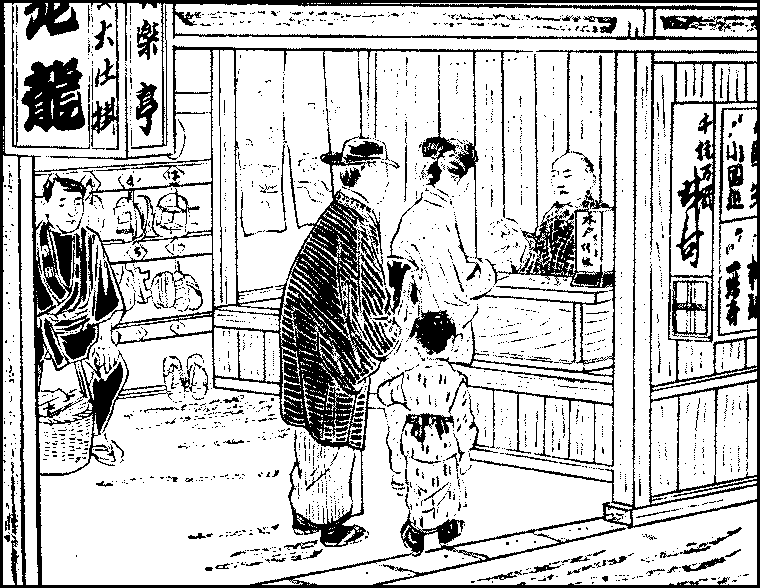 Still there remain many occasions on which the Tokyo cit may take his pleasure at home and abroad. The first of these, the New Year’s Day, presents the gayest appearance everywhere and is a day of general rejoicing. On either side of the gate or front door at every house stands a large pine branch supported by an unstripped bamboo-pole or two, and overhead flies the national flag. On the cross-beam of the gate or over the porch hangs a coil of sacred rope, to which are attached a piece of fern, a lobster, a bit of konbu (laminaria), and an orange. Indoors too, a piece of rope with a frond of fern is suspended in different rooms. In the morning when the family gather for breakfast, a set of three wooden goblets are brought on a stand, and the members of the household wish one another a happy New Year and drink spiced mirin with one of the{289} goblets in the order of their position in the family; and instead of the usual boiled rice, they eat cakes of pounded rice roasted and boiled in a soup of greens. This drinking of mirin and eating of rice-cakes is repeated on the two mornings following. On the New Year’s Day people go out to present the New Year’s greetings to their friends and relatives. This custom is now less observed than formerly; for in these days they greet one another by post, and millions of postcards pass through the Tokyo post offices in the beginning of the year. On the New Year’s Day larger shops are closed, as well as offices, public and private. The streets are gay with the New Year’s decorations and with people going to and fro for the New Year’s greetings; while in streets of shops and small houses young men and women and children may be seen playing at battledore and shuttlecock in the open road to the great obstruction of the thoroughfare, the fun of the game being that those who miss a shuttlecock have their faces smeared with Indian ink or white paint.