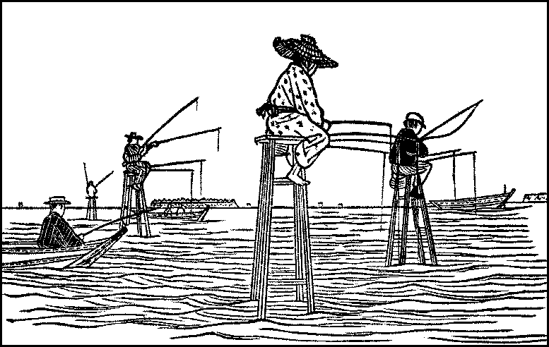 Fishing has many votaries. Boats put off from Shinagawa for{307} fishing in the Bay of Tokyo, especially in summer and autumn; the fish are caught either with nets or with rod and line. Anglers may be seen at all seasons on the banks of the little rivers and canals which traverse the city; but their catch is quite insignificant. The most interesting method of catching fish is, perhaps, cormorant-fishing in the Tamagawa, a river which runs a few miles west of Tokyo, where cormorants are, as in the River Nagara in Gifu Prefecture, which is celebrated for this form of fishing, employed to catch the plecoglossus altivelis, which abounds in the river. The bird has a tight ring around its crop, and when it has dived into the water and swallowed enough fish, the ring is pulled up and the bird is made to disgorge them. Another curious sight is the angling for the sillago. This fish is keen-sighted and very active, and takes fright and darts away as soon as it sees a boat rocking on the water. As, however, it is to be found in comparatively shallow water, a gigantic stool is set on a shoal, and the angler sits on it and patiently waits for the fish to take the bait. A boat remains not far off for emergencies, as when the angler, in his eagerness, loses his balance and goes bodily after the sillago. On a calm day, several of these stools are to be seen off the beach at Shinagawa.
