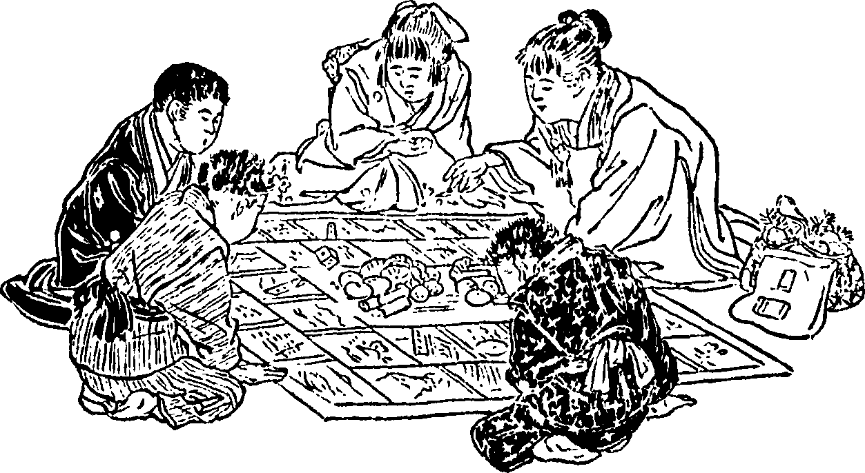 The Japanese indoor games we have above described are played mostly by children and young men and women, with the exception of the fox-ken, which is almost confined to convivial parties. The great serious games for grown-up people in the evenings, or in the daytime for that matter, are chess, go, and “flower-cards.”