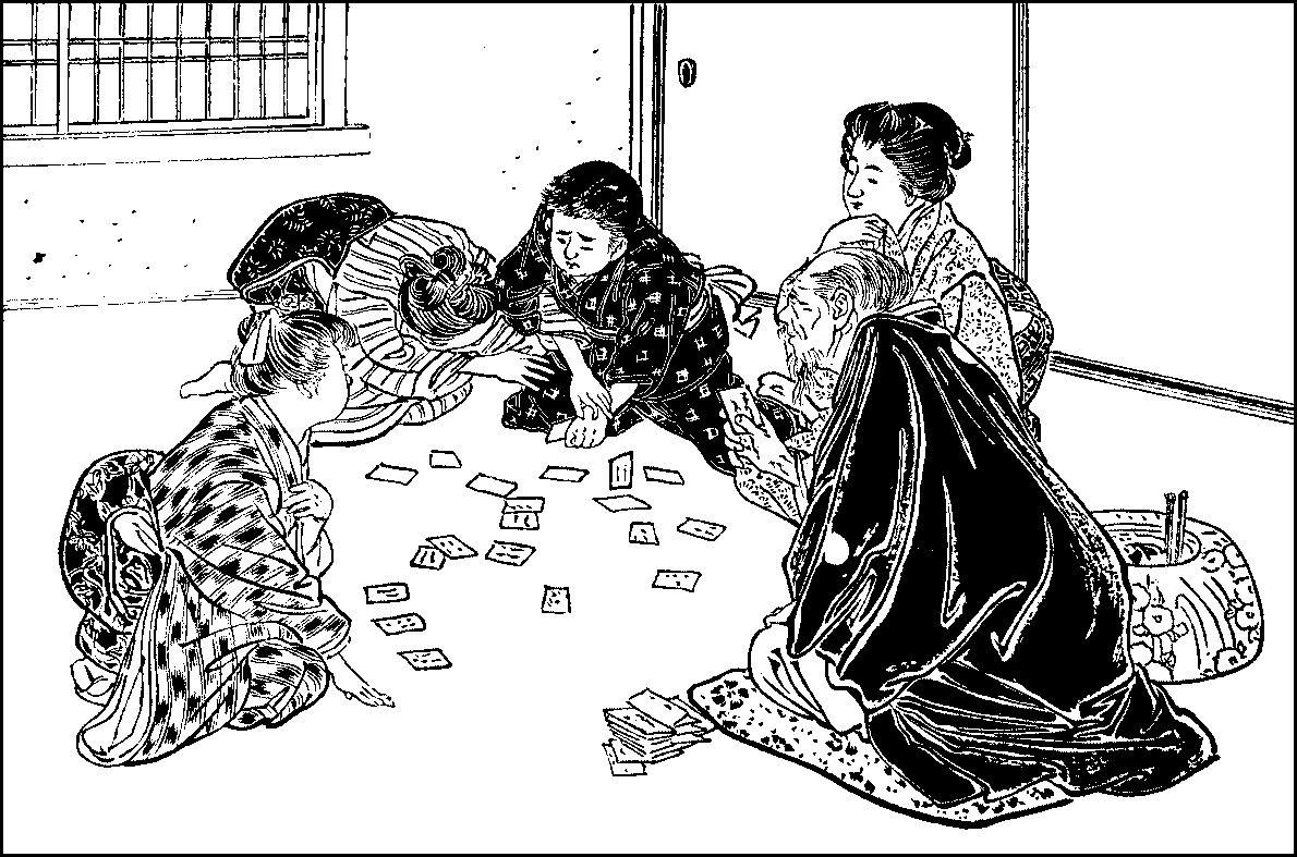 Sugoroku is played in the long winter evenings, and especially during the first days of the New Year. Among other New Year’s games may be mentioned the cards known as the Iroha and uta cards. Iroha, being the first three characters of the Japanese syllabary or alphabet, is the name given to the whole syllabary; and the iroha cards are so called because they have inscribed on them each a proverbial saying beginning with a different character of the syllabary. There are forty-seven characters in the Japanese syllabary, and another card is added to make the number even and{311} divisible. Besides the pack of forty-eight cards with the proverbs, there is another of the same number of cards with pictures corresponding to these proverbs; these latter have also marked in the corner the first character of the proverbs they illustrate to facilitate identification. Thus, if the card in the first pack has the proverb, inu mo arukeba bō ni ataru (A dog, by walking, may come upon a stick, a saying which is now taken to mean that by wandering about, one may meet with good fortune), the corresponding card in the other pack has a picture of a dog knocking against a stick and the character i in the corner. The card of the second character of the syllabary has the proverb, ron yori shōko (Proof is better than argument), and the third has hana yori dango (Better a dumpling than a flower, that is, use is better than ornament), and so on. The illustrations in the second pack are often fanciful, as they cannot but be when the proverbs do not refer to concrete objects. Thus, the illustration to the second proverb above given has an angry man with one hand on his sword and holding in the other the straw figure which the jealous wife used in the old days to nail to a tree at dead of night when she invoked curses upon her rival. The man is apparently showing his wife in spite of her protestations the straw image she has been using against his mistress. The game is played sometimes by spreading all the pictures in the middle and the players sitting around them. One person reads out the proverbs in any order he pleases, and the corresponding pictures are seized and put away. The player who has taken the largest number of cards in this way is the winner. The game, however, is more frequently played in the following manner:—The cards are dealt evenly among the players who spread them out exposed before them. When a proverb is read out, a player takes out the corresponding picture if he has it, and if not, he looks over the other players’ hands and seizes the card as soon as he sees it. He takes it and gives one of his own exposed cards to the player from whose hand he has taken it. A slow-witted person’s hand is always full, while a sharp player clears his quickly; and the one who has first got rid of his hand is the winner. As the cards are often pounced upon at the same time by several players, the game is an exciting one, and not a few come out of it with their hands scratched and bleeding. Friends and relatives of both sexes join in these games in winter evenings, and some of them, it is said, consider it the best part of the game that they can touch or squeeze the hands of the players of the opposite sex by pretending to seize the same cards. For this reason, a strict paterfamilias not unfrequently forbids his household to play the game with those who are not its members.
