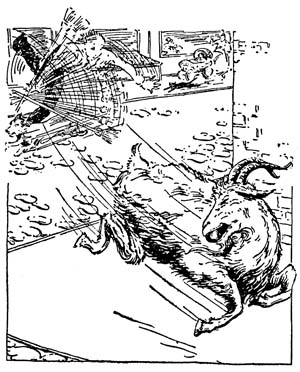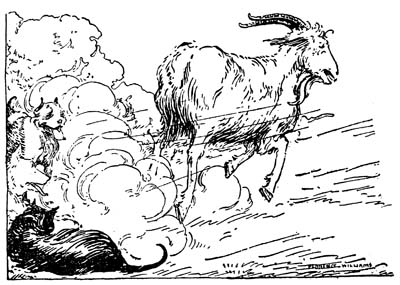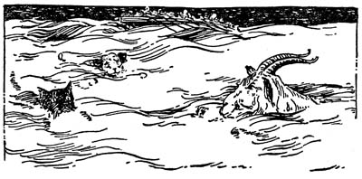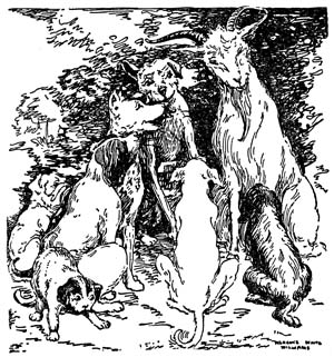 The dogs stood spellbound. What was the big goat going to do? Butt their wounded hero? If so, why should he wish to butt a perfectly harmless dog he had never seen before? But had he never seen him before? Perhaps they had met and fought on the battlefield and were enemies. If so, they must all run and protect their hero from the long horns of the strange goat.