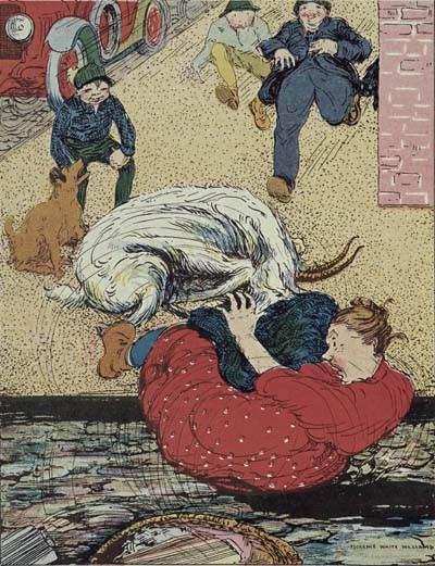 “Bow! Wow! Wow!” came the short, sharp, snappy barks from a short-legged Scotch terrier as they bounded out of a gate beside the road, ready to pounce on Billy. They were followed by poodles, collies, St. Bernards, and all manner of dogs, both great and small. Billy thought he had never seen so many dogs of different breeds in one place in all his life. You see he had run into a dog hospital, and these were the convalescent dogs which were allowed to play together in the yard.