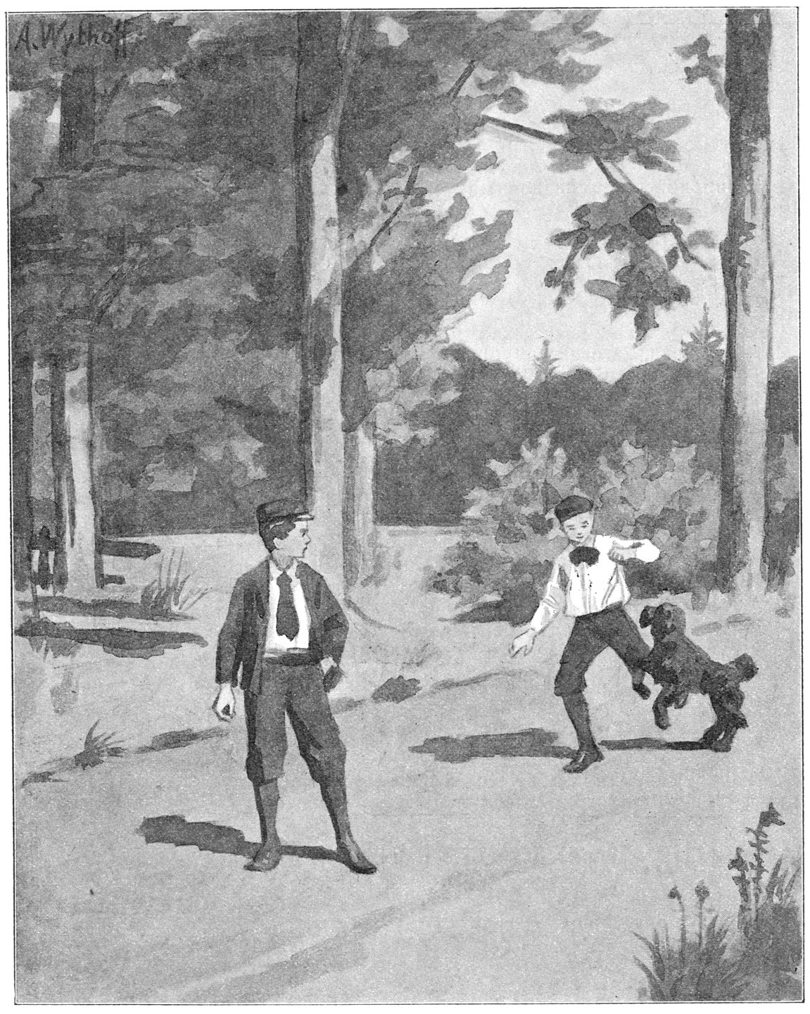 Pandoer springt vroolijk vooruit, hapt naar een uitgetrokken plukje mos, schudt het heen en weer en gooit het spelend in de lucht; dan weer vervolgt hij een brommende groene vlieg en kijkt [8]telkens om naar zijn baas, die met groote passen over den ongebaanden weg loopt, recht op zijn doel af, naar den hollen zandweg die naar Conifera voert. Hij springt van den hoogen boschgrond, midden in het diepe wagenspoor en Pandoer rent luid blaffend vooruit en keert terug, springt om Arthur heen en dan weer vooruit, telkens takjes in den bek nemend en weer weg werpend.