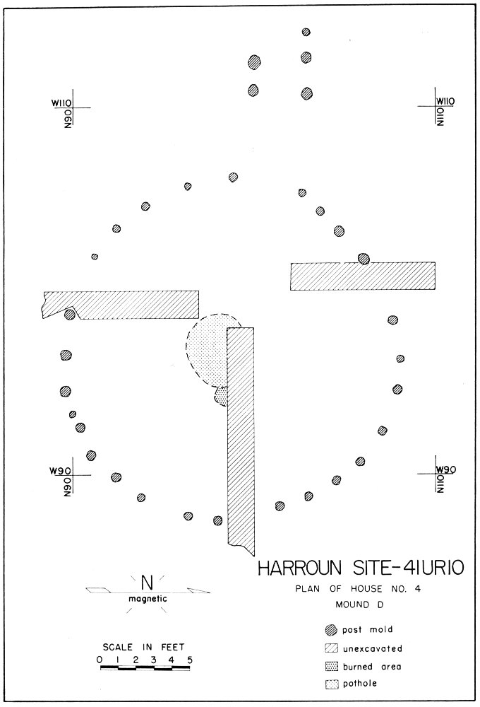 4. Remains of true earth lodges in the Plains area show superficially as depressions, often with a low ring-shaped mound around the perimeter (Wedel, 1936: 24; Lehmer, 1954). Sometimes the depressions result in part from the shallow pits in which the lodges were built. But even when an earth lodge was built directly on a flat surface rather than in a pit, the mound left behind when the lodge collapsed has a concavity in the center instead of being convex as were the mounds at the Harroun Site. It is significant that Mound D was prominent and convex in shape even though the house it covered had been built in a pit. Certainly it is 57 difficult to visualize an earth lodge—whether built in a pit or not—collapsing in such a manner as to produce a smoothly convex mound like those at the Harroun Site.