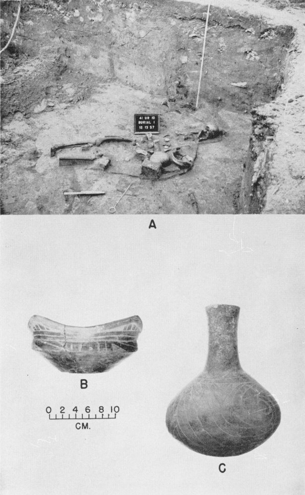 Fig. 12. A, Burial No. 1, Mound A, looking northwest; B and C, pottery vessels of type Ripley Engraved, associated with Burial No. 1.