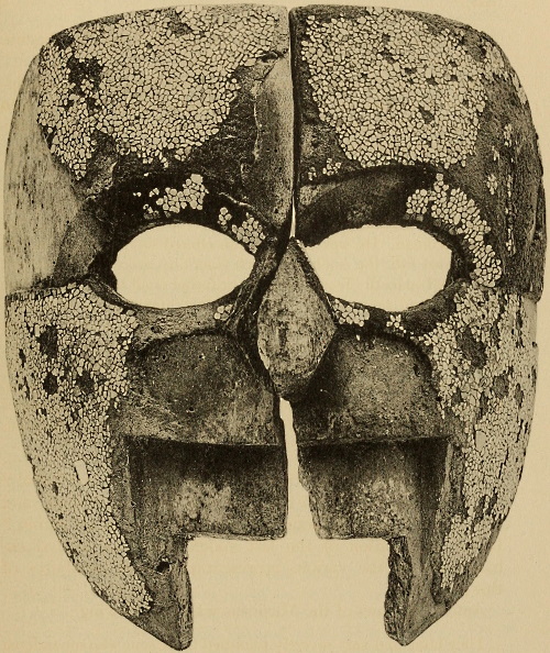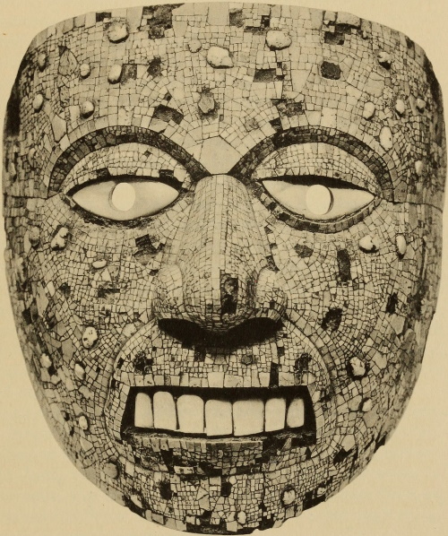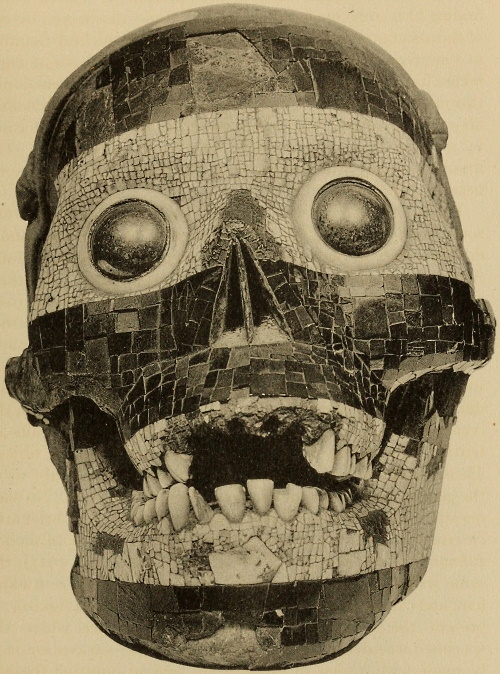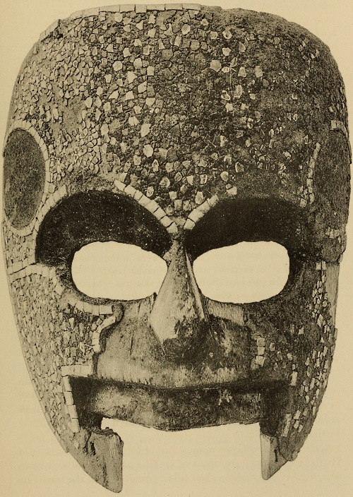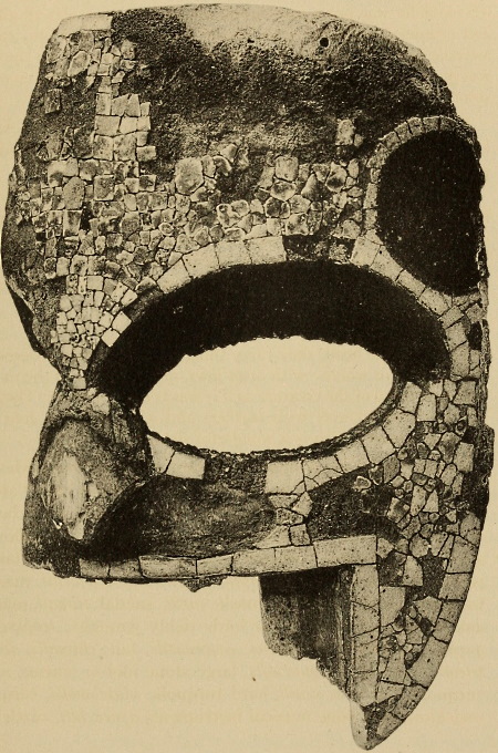 Under the title “Montezuma’s Gifts to Cortés,” Maudslay describes (Appendix, pp. 299-302) and illustrates (pl. 13-16) the three mosaic masks in the British Museum. Pl. 16 is a rear view of the skull mask showing the leather strap by which it was attached to the head. This mask Maudslay identifies as probably that of Tezcatlipoca, and the other two as belonging to Quetzalcoatl.