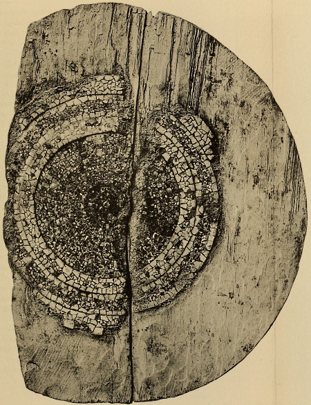 In this article Colini (pp. 324-325) describes two masks and an idol in the Museo Borgiano in Rome. Regarding these specimens he quotes from Vitæ Synopsis Stephani Borgiæ, S. R. E. Cardinalis amplissimi, S. Congr. de Propaganda Fide Præfecti, Roma, 1805, p. 44, “Classis mexicana: multa lignea et testacea idolorum simulacra forma et figura singulari, ac gente mexicanæ propia.” He describes the idol as being made of wood in the form of a human figure, 45 cm. high. The two masks of wood are described, and figured on the plate containing drawings of other American antiquities. It is highly probable that these three objects were formerly decorated with mosaic.