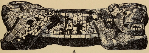 Dr. Peñafiel, in chapter XXIII, under the heading “Incrustaciones de Mosaico,” describes some of the mosaic pieces in Europe which he states are the most important specimens. “Of this class of works the Museo Nacional (Mexico) can count as having only one, in the statue of Coatlicue coming from Tehuacan.” On pl. 26 are given the British Museum knife, and the two knife-handles in Rome; on pl. 117 one of the masks in Rome; on pl. 118(A) the skull mask in Berlin, and (B) the mask in Rome; pl. 123 is the femur musical instrument in Rome; and pl. 168 restorations of the knife-handle specimens with blades, in Rome. These illustrations are all in colors, excepting the last.