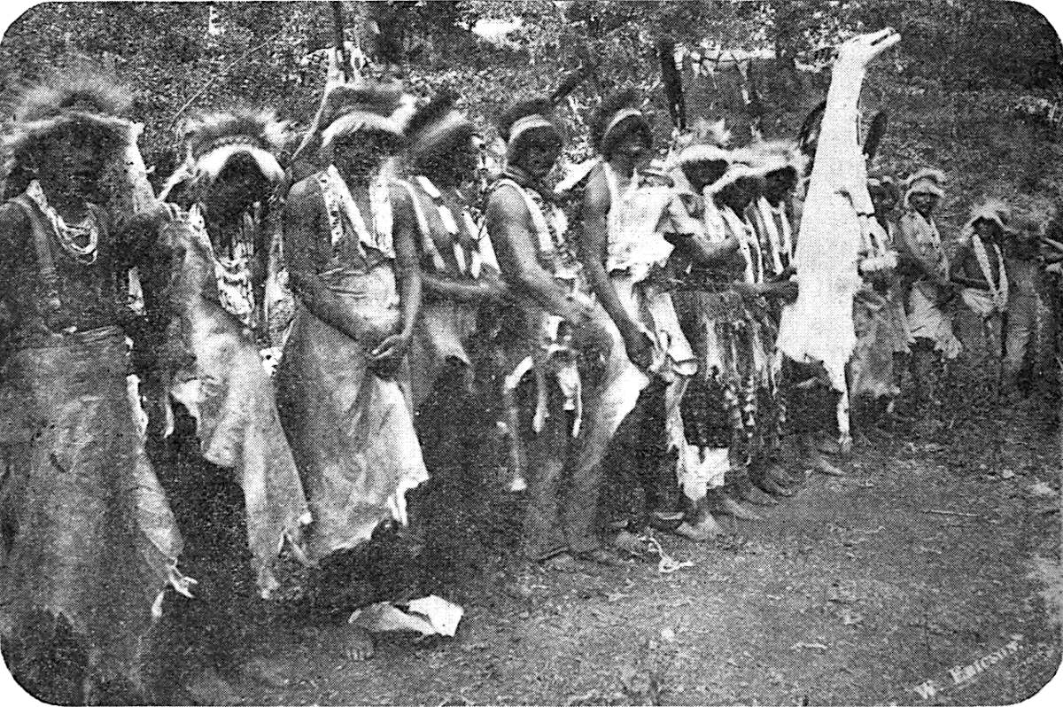 The first living thing placed upon the earth was the white deer (Moon-chay-poke). The white deer roamed over the hills, mountains, in the valleys and on the plains. He was the pride and dignity of the animal kingdom. This is why the Klamath Indians revere the white deer that is so sacred to their hearts and use the skin as an emblem of purity, in one of their56 greatest festivals, or worships, which is termed in English as, “The White Deer-skin Dance.” In the Indian language it is called, “Oh-pure-ah-wah”; which does not mean dance but means one of their most sacred religious festivals.