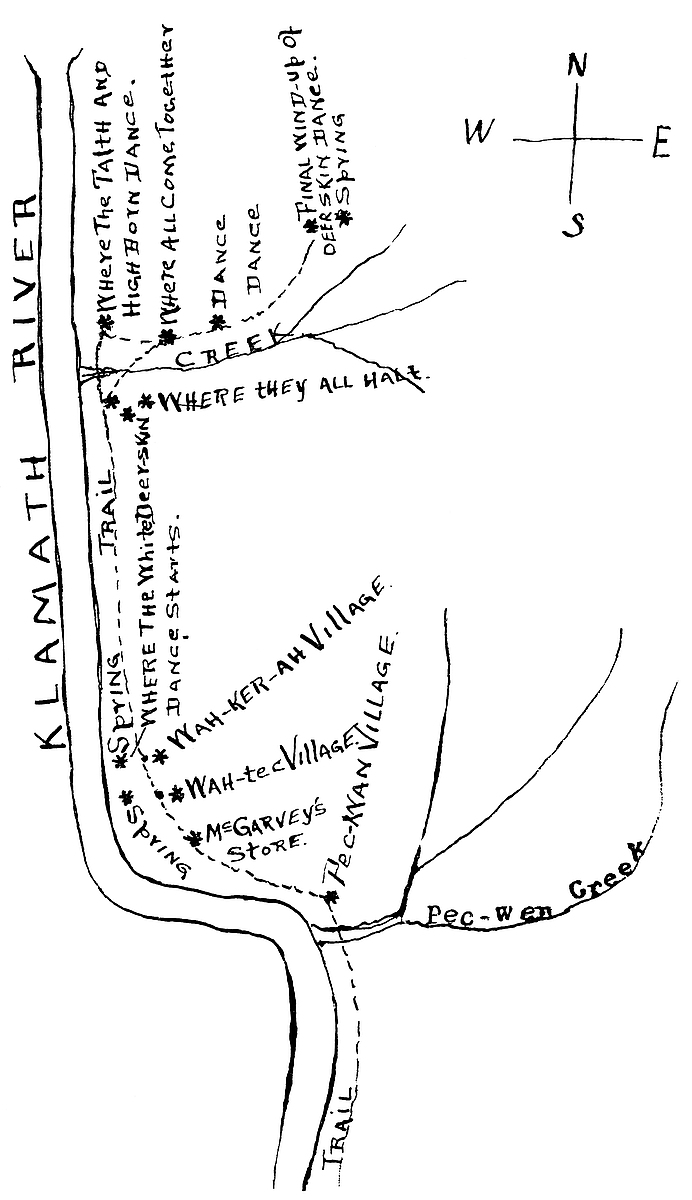 Around this store there are many tales woven, and I will tell quite a number of them, using this place as a center to start with, as this is where the lower Klamath Indians have their White Deer-Skin dance and a short distance above the store is where one of their sacred lodges is located. They have the true name of God which is used in the lodge only in a low whisper, and outside of the lodge when three or four of them are out in a secret place, and then only in a whisper when they are burning certain roots and herbs that give sweet and pleasant odors to their God. While the festival is being held all difficulties are settled. Those of lower birth at the present time are pretending to carry out the worship, but for the past few years have made a sorry affair of it.