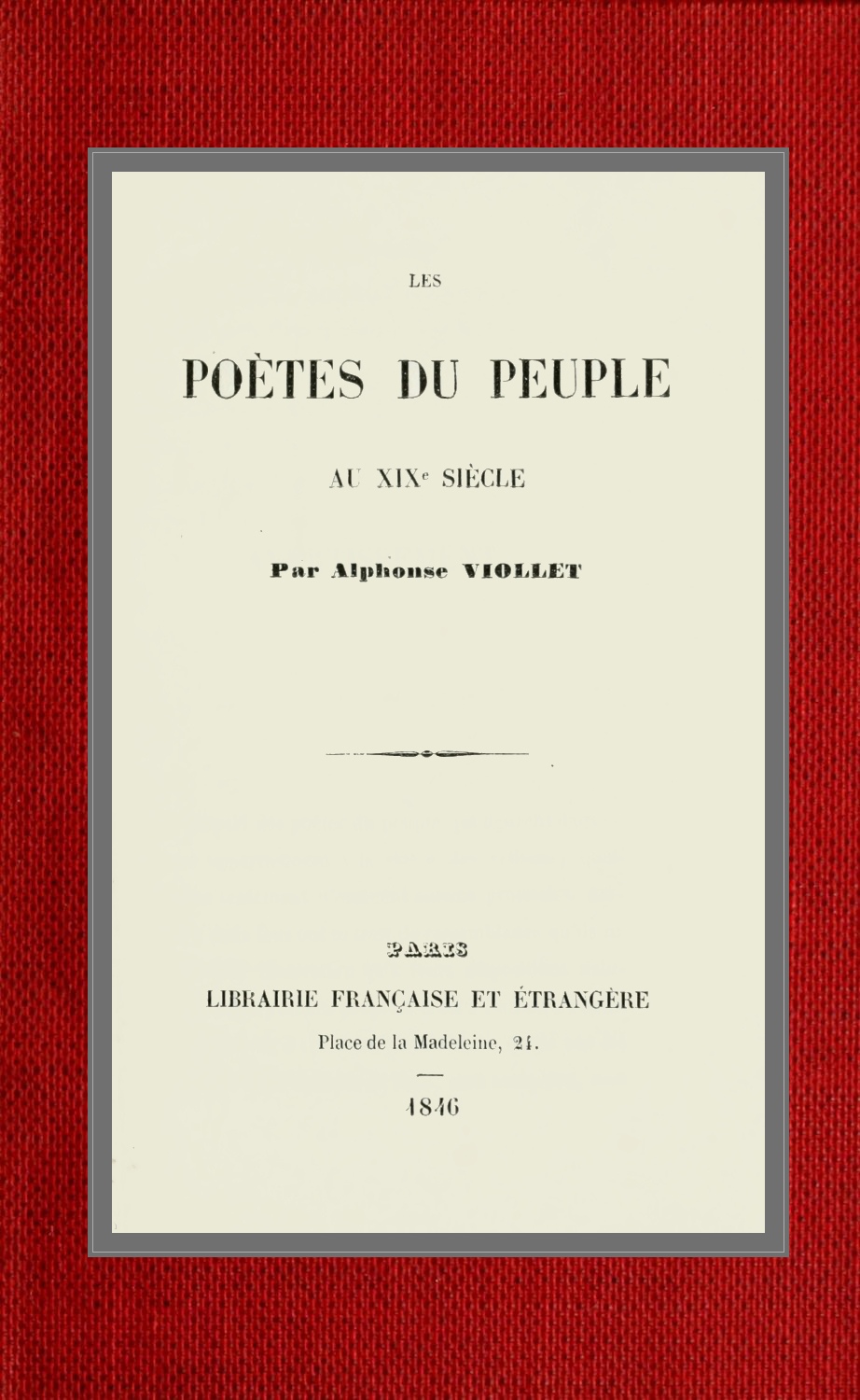 En réunissant ici, comme dans un tableau de famille, tous ces poètes naturels des diverses provinces de notre France, nous désirons les unir l’un à l’autre par les liens d’une estime et d’une affection réciproque. Après avoir lu notre livre, quelque distance qui les sépare, ils se connaîtront tous, et ils seront excités par l’exemple à de nouveaux progrès dans le bien.