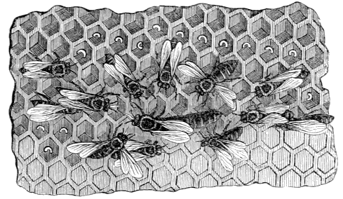 It is enjoyment to stand by one's bee-hives and watch the intense and untiring work of one's bees. It is like standing at a window in Cheapside, and watching the counter-currents of human beings that ceaselessly traverse its pavement; only, instead of faces grooved with cares and pale with anxieties, we do not see issuing from their hives or returning home a single bee that seems bowed down with trouble or fretful about the future. Each bee, from the queen down to the sentinel at -7- the gate, seems to have heard the Master's words,—"Take no thought" (i.e., irritating care) "for the morrow, for the morrow shall take thought for the things of itself. Sufficient unto the day is the evil thereof."