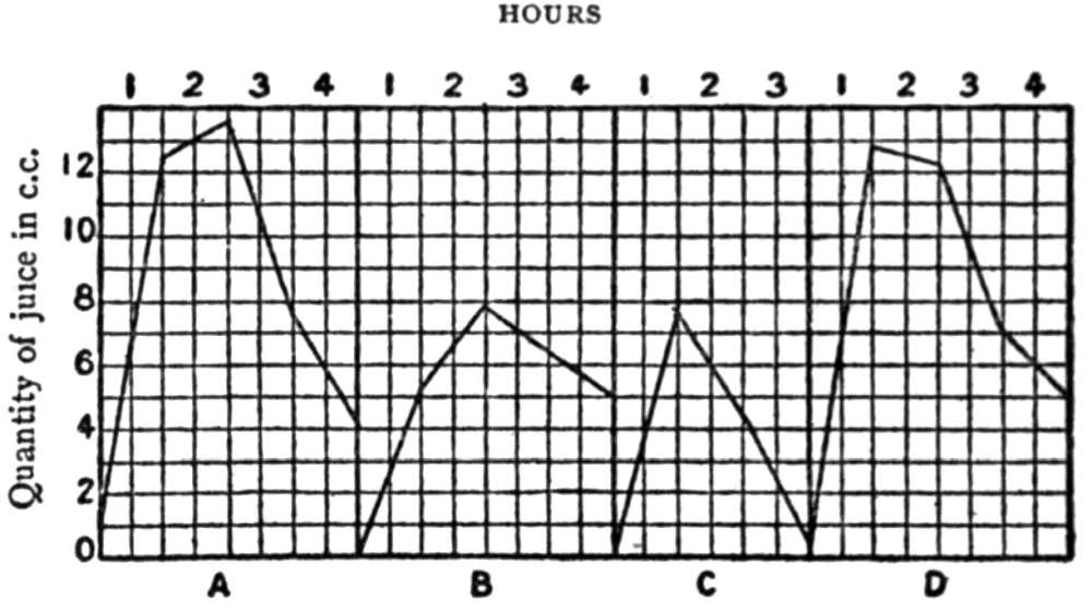 [32] An investigation by Cannon and Day (American Journal of Physiology, 1903) has confirmed this conclusion. An hour after starchy food mixed with saliva was ingested a unit volume of the food in the cardiac end of the stomach contained almost twice the amount of sugar found in a unit volume of the food in the pyloric end.
