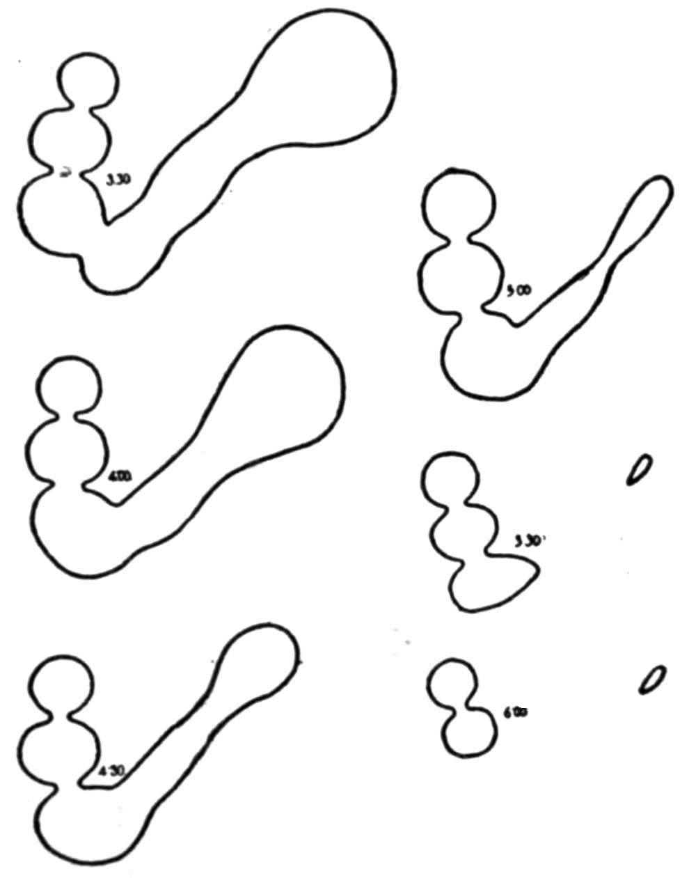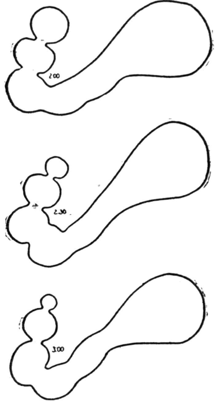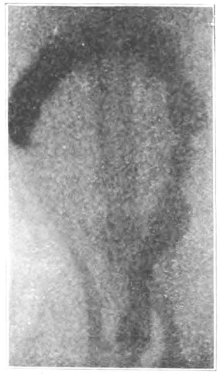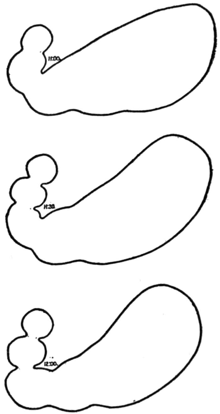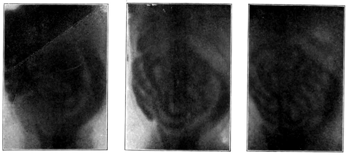 [34] Without the possibility of seeing the relations of a movement to the ends of the intestine, it cannot be stated absolutely whether the movement is peristaltic or antiperistaltic. Such relations can be seen on the fluorescent screen only near the stomach and near the ileocæcal valve. The evidence that advancing peristalsis is the normal movement is so overwhelming that I have assumed that when food is moving in loops not visibly related to fixed points it is moving forward.