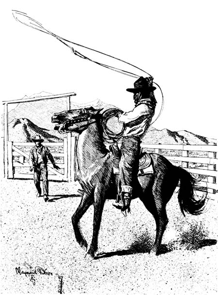 “This morning,” said Madison, “I was afraid that I wouldn’t be able to get my star bronco buster out for your edification, Lawrence, for the boys have been telling me that he has been ‘hitting the jug’ pretty lively down at the store for the past twenty-four hours (he’s never been much of a drinker, either), but when I told him Miss Glendower wanted to show you the convolutions of a bucking horse, it seemed to sober him up a bit, and he not only promised to furnish the thrills, but to do the business up with all the trimmings on—for he’s going to ride ‘Sobrepaso,’ a big, blaze-face sorrel that they call ‘the man killer,’ and that every vaquero in the country has given up unconquered. Mesquite himself refused to mount him again, some time ago; but today he is in a humor that I can’t quite understand—even allowing for all the bad whiskey that he’s been getting away with—and seems not only ready but eager to tackle anything.”