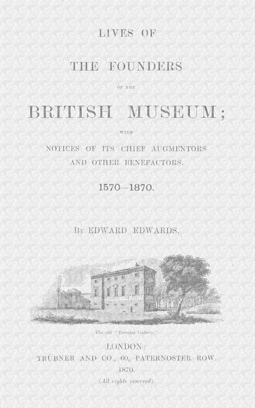 The real founders of our British Museum have been neither our British monarchs nor our British legislators, as such. They have been, commonly, individual and private British subjects; men loyal both to the Crown and to the People. Often, they have been men standing in direct lineal descent from the great Barons who dictated the Charter of our liberties, in the meadow near Windsor, and from those who led English knights and English bowmen to victory, on the wooded slopes near Poitiers. Sometimes, they have been men of very lowly birth; such as could point to no 6ancestral names appended to Magna Charta, or to the famous letter written from Lincoln to Boniface the Eighth; such as may, indeed, very well have had ancestors who gave their lives, or their limbs, for England at Poitiers or at Cressy, but who certainly could point to no heraldic memorials of feats of arms done on those bloody fields of France. Not a few of them, perhaps, would have been vainly asked to tell the names of their grandfathers. One boast, however, is common to both of these groups of our public benefactors. They were men who had alike a strong sense of gratitude to those who had gone before them, and a strong sense of duty to those who were to come after them. To nearly all of the men whose lives will be told in this volume are applicable, in a special sense, some words of Julius Hare:—‘They wrought in a magnanimous spirit of rivalry with Nature, or in kindly fellowship with her.... |J. & A. Hare, Guesses at Truth, vol. ii, p. 18.| When they planted, they chose out the trees of longest life—the Oak, the Chestnut, the Yew, the Elm,—trees which it does us good to behold, while we muse on the many generations of our Forefathers, whose eyes have reposed within the same leafy bays.’ They were men whose large impulses and deep insight led them to work, less for themselves than for their successors. It is by dint of what men of that stamp did—and did, not under the leading of the Gospel according to Adam Smith, but of a Gospel very much older than it—that upon us, whose day is now passing, Posterity, so to speak, ‘has cast her shadow before; and we are, at this moment, reposing beneath it.’ Of Public Benefactions, such as those which this volume very inadequately commemorates, it is true, with more than ordinary truth, that we owe them, mainly, to a generous conviction in the hearts of certain worthies of old days that they owed suit and service to 7Posterity. This may, indeed, be said of public foresight, when evidenced in material works and in provisions to smooth some of the asperities of common life and of manual toil. But it may be said, more appropriately still, of another and a higher kind of public foresight;—of that evidenced in educational institutions, and in the various appliances for raising and vivifying the common intellect; for enlarging its faculties; diffusing its enjoyments; and broadening its public domain. As it has been said (by the same acute thinker who has just been quoted) in better words than any of mine:—‘The great works that were wrought by men of former times; the great fabrics that were raised by them; their mounds and embankments against the powers of evil; their drains to carry off mischief; the wide fields they redeemed from the overflowings of barbarism; the countless fields they enclosed and husbanded for good to grow and thrive in; ... all this they [mainly] achieved for Posterity.... |J. & A. Hare, Guesses at Truth, vol. ii, p. 13.| Except for Posterity; except for the vital magnetic consciousness that while men perish, Man survives, the only principle of prudent conduct must have been, “Let us eat and drink, for to-morrow we die.”’