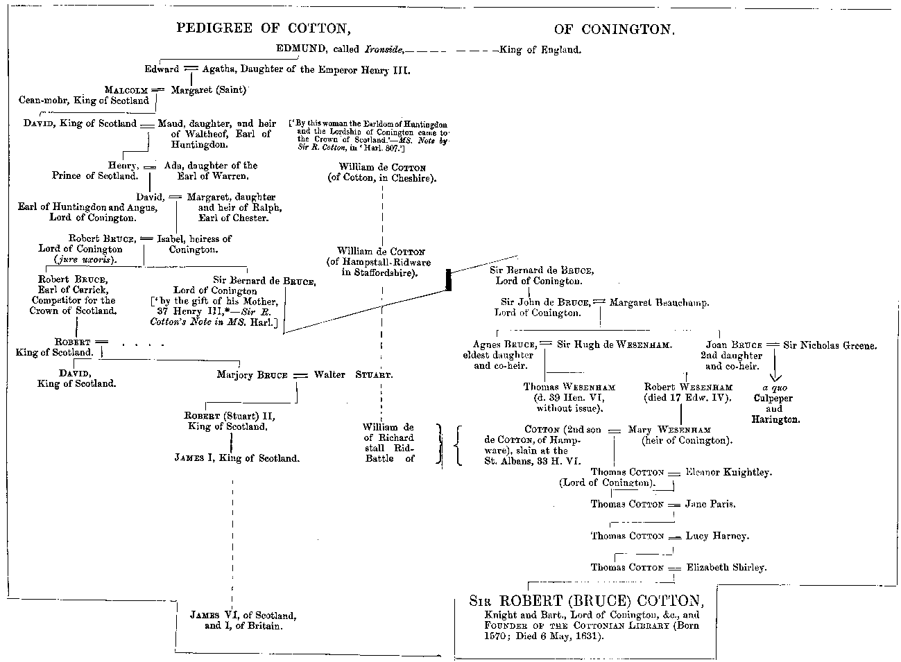 1. Sir Robert’s father was the fourth ‘Thomas Cotton of Conington,’ and fifth Lord of that manor of the Cotton family. The marriage of William Cotton with the eventual heiress of the Huntingdonshire Bruces was contracted about the year 1450.