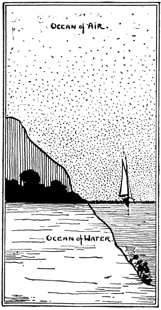 As the fishes live at the bottom of the ocean of water, mankind lives at the bottom of an “ocean of air.” (See Fig. 2.) No one is absolutely certain about the depth of this air, but it has been estimated as low as forty miles and as high as two hundred miles. Balloons have gone up to a height of nearly nineteen miles (100,320 feet). We do know that the higher we go, the thinner the air becomes. It is practically impossible for man to ascend into the air more than five or six miles, owing to the fact that the air above that height is so thin that there is not enough to breathe. Naturally, the air at the bottom is more compact because of the vast amount of air above. The air is a great weight lying upon us—14.7 pounds per square inch of surface.