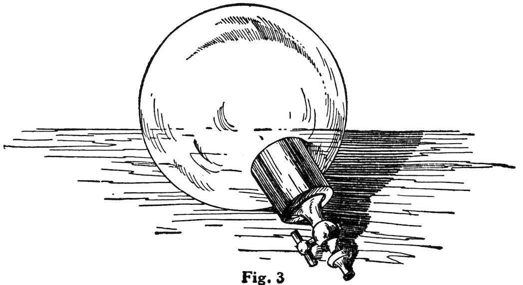 The air-globe is a piece of apparatus for demonstrating that air has weight. (See Fig. 3.) First, the air-globe is weighed and then the air is pumped into it; its stop-cock is closed and the globe is reweighed. It will be found to have gained in weight. This is conclusive that air is matter and that it has weight.