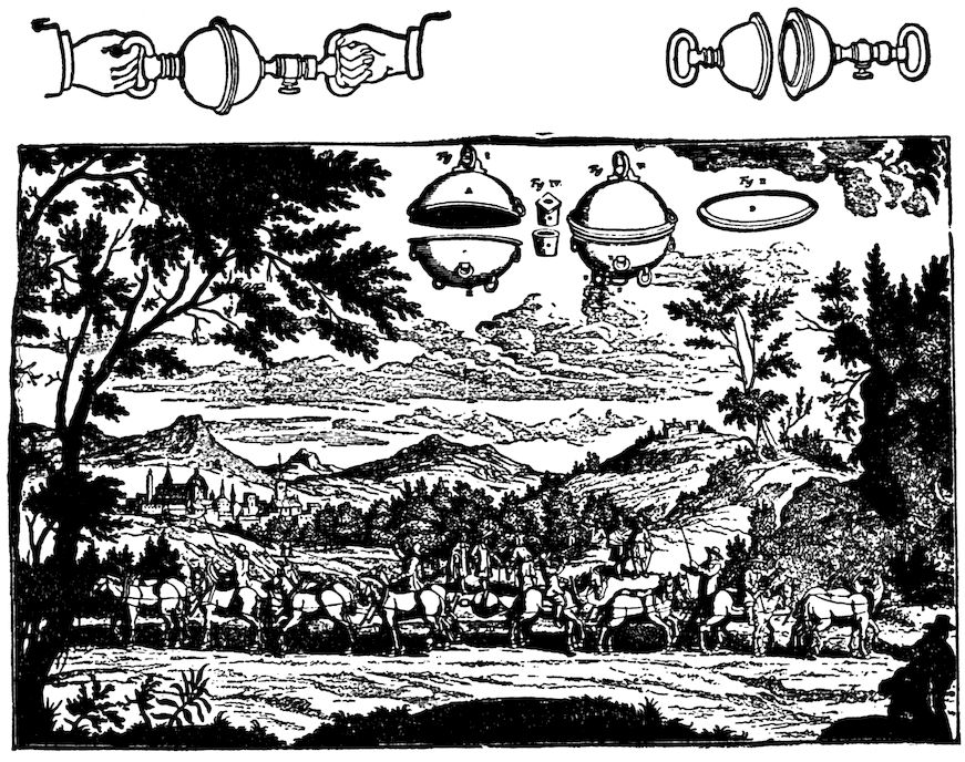 By placing two hollow hemispheres of copper (see Fig. 6) together, and exhausting the air, he found that fifteen horses pulling one way and fifteen pulling the opposite were unable to pull the hemispheres apart.
