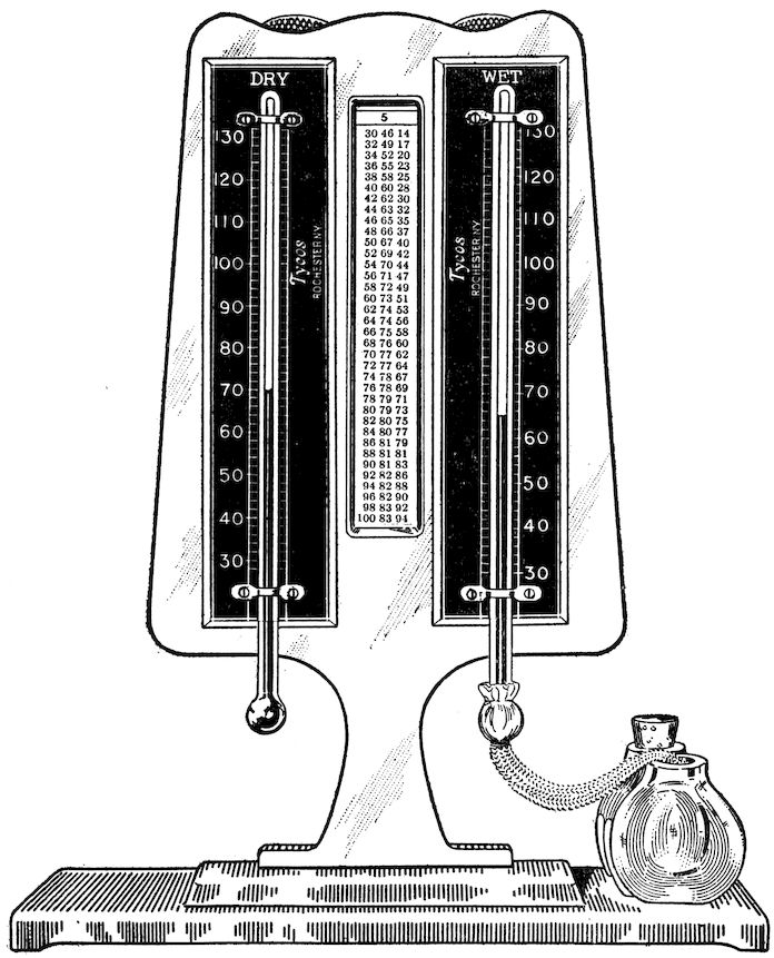 The state of the air with respect to the vapor that it contains is called its humidity. The humidity is said to be high when the air is damp, and low when the air is dry. Humidity and moisture in the air are important factors about the weather. It is lack of humidity that has more to do with poor health, colds, and catarrh than anything else. The importance of proper humidity in houses and buildings cannot be emphasized too greatly. Proper humidity will save twelve and one-half per cent in the cost of heating. The great majority of people are under the impression that colds are caused by sudden change in temperature, but the most colds are actually caused by stuffy, hot rooms. The reason that some people complain that 70° is not hot enough is because the humidity is too low, but if the moisture is brought into the air at a proper degree, the humidity is maintained. You will find that 68° will be a proper temperature to maintain in a room. The reason for this is that the air in the room is dry and the heat actually goes through it. In other words, it does not warm it; moist air stops radiation. Consequently, the result is that it warms it. In other words, moisture is nothing more than clothing, and this accounts for the fact that in a hot room, where there is no moisture, we heat our rooms beyond the degree that is necessary in order to feel any reasonable amount of comfort. Dry air allows too much radiation from the body and too rapid evaporation, which makes us cold.
