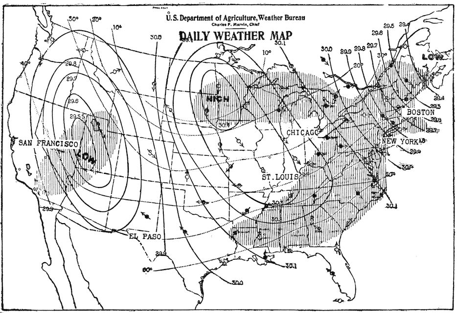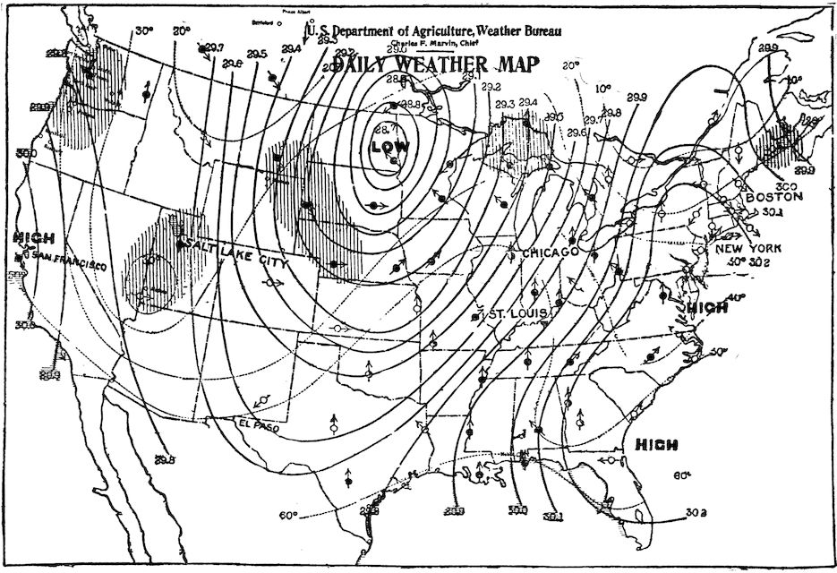 From the markings and printed matter on each map, information is secured regarding observations of the barometer, thermometer, wind velocity, direction of the wind, kind of clouds, and their movements, and the amount of precipitation (rain or snow), in different localities.