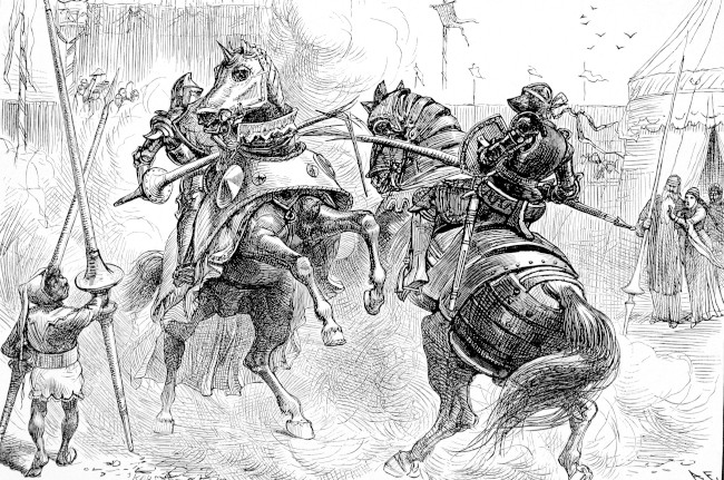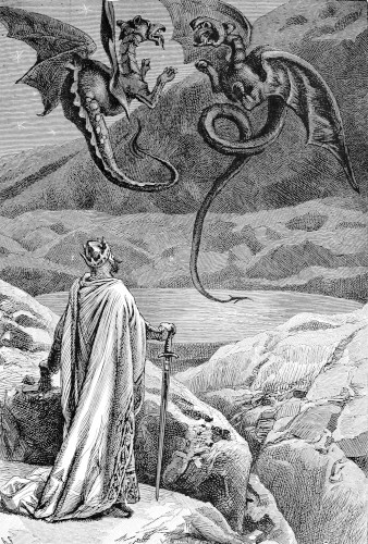 And then words arose between these two kings so bitter that they summoned their soldiers and fell to war wherein they continued until the armies of both were nearly destroyed. Seeing that such was the fact, Rhitta the giant, King of Wales (who is Sir Thomas Malory's King Ryens of North Wales), levied war against both, as being madmen dangerous to all their neighbors; and, having defeated their forces, he cut off the beards of kings Nynniaw and Peibiaw. But at this time there were twenty-eight kings in the Island of Britain, and when the others heard of these things, they marched all together against King Rhitta to avenge the insult of the beard. In the battle which followed, however, Rhitta was again victor. "This field is mine," said he, and cut off the beards of those kings. These matters being told abroad, the kings of all the surrounding countries made common cause against Rhitta, and presently waged a great battle with him. Still, Rhitta conquered all these. "The great field is mine," he said again; "and," cutting off all their beards, "these are the herds that fed in my field; but I have driven them out." Then he made a mantle for himself out of all those beards, and although he was a giant twice as large as the largest man ever known, that mantle reached from his head to his heels.