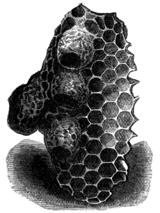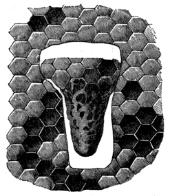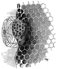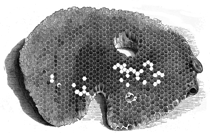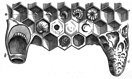 Firstly, then, the shaping of the cells with definite and constantly repeated angles of the sides; the arrangement of them, so that the base of each is formed by the junction of the bottoms of three cells on the opposite side of the comb; the preparation of abodes suitable in size, and in other special respects, for the larvæ of queens, drones, and workers; and the careful transition from one to the other of the last two—all these and other circumstances connected with the construction of their dwellings, attest the possession of an innate faculty needing no instruction from the elders of the hive.