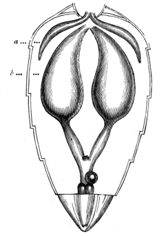 Another instance, equally interesting, is seen in the well-known cineraria tribe. The plants of this genus belong to the composite order, in which what is usually called the blossom, consists of many flowers, grouped together on one head. In the example before us, there are nearly 200 thus aggregated. These florets separately open at different times, those of the outer circles coming before those nearer the centre. The pollen-tube of each is formed by five anthers, fastened together at their edges, and discharging their - 250 - pollen into the space between them. At the lower part of this inclosure the pistil is growing, but is not in a condition to receive usefully the fertilising powder. It, however, as it advances, sweeps out, and carries up with it, the pollen-grains, so that they may be conveyed to other florets of the same or other blossoms, to effect their vitalising work. At length the pistil, with its brush on its summit, comes into view, but, even yet, is not sufficiently developed for fertilisation. In due course, however, the upper end splits, and exposes the surface of the stigma ready for the pollen, which must be brought from some other floret, and probably from some other blossom. Thus cross-breeding is effectually secured.
