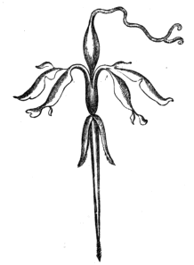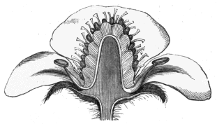 Passing now to plants in which the pistil develops earlier than the stamens, we may note the knotted figwort (Scrophularia nodosa). On making a section of a recently opened flower, the style, with its stigma, may be observed protruding just beyond the lip of the corolla, while the stamens are hiding away, as it were, in a little pouch below the entrance of the - 254 - blossom. When fertilisation by pollen from another flower has taken place, the pistil droops and withers; while the anthers grow upwards to the mouth of the corolla, and present their nectar to the honey-seekers, for conveyance to other flowers of the species.