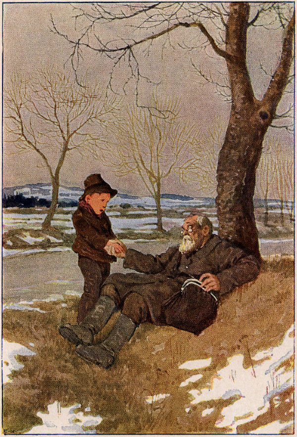 Fritze erschrak. Er sagte aber nichts, sondern versuchte nur seine Beine zu befreien. Arne beugte sich[21] rasch hinab, um sich den Fremden näher anzusehen. Doch dabei entglitt ihm sein Apfel und traf Herrn Fries an die Nase.