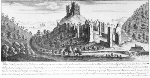 This Castle, was built by Baldwin de Bronys, & was at first call’d Ochementon; it descended to Rich. de Rivers or Riparus, & from him to his Sister Adeliza, who marrying one of the Courtenays, it came into that Noble family, & so continued til K.E.IV. seized it, for their adherence to the House of Lancaster. K.H. VII. restord it to the Courtenays, but K.H.VIII. again alienated it & dismantled the Castle & Park, yet Ed. Courtenay in Q. Marys Reign obtain’d a Restoration, but he dying without Issue Male, it came by a female into the Mohuns Barons of Mohun & Oakhampton, & by the like failure of ye male it came by marriage to Christopher Harris of Heynes Esqr.