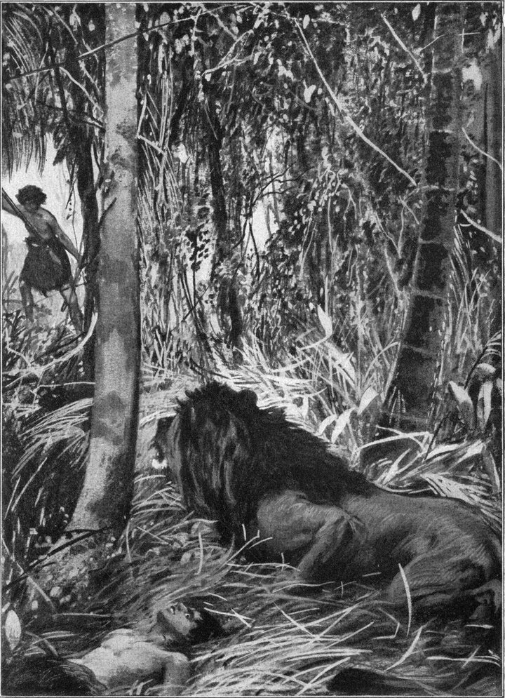 Da ging der Löwe auf die beiden zu; aber als[S. 8] er vor ihnen stand, verlor er plötzlich den Mut. Er verstand die Sache selbst nicht, denn er hatte ja sonst vor nichts im Walde Angst. Aber die beiden neuen Tiere hatten so seltsame Augen und wandelten so frohen Mutes dahin, daß der Löwe dachte, sie müßten über irgendeine geheime Macht gebieten, die er nicht sehen könnte. Ihre Zähne taugten nicht viel, und ihre Krallen waren nicht der Rede wert. Aber ein Geheimnis mußte ja an ihnen sein.