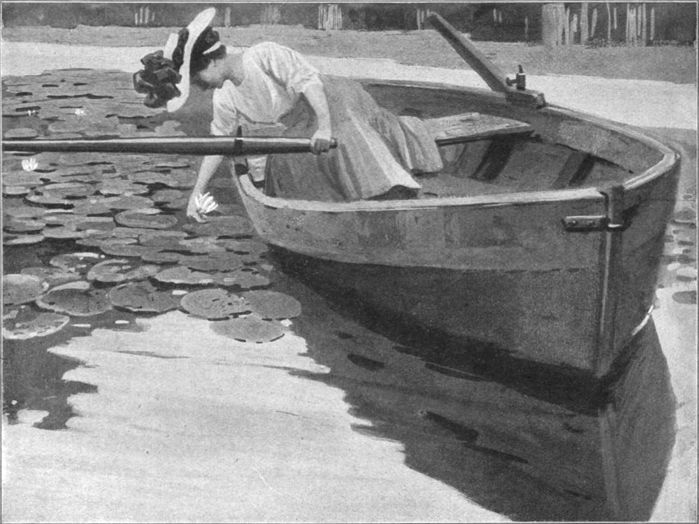 Schließlich wurden sie müde und setzten sich an einer Quelle nieder. Sie beugten sich über das rinnende Wasser, tranken und lachten ihrem eigenen Spiegelbilde zu. Und dann brachen sie saftige Früchte von den Bäumen und aßen sie. Als die Sonne unter[S. 11]ging, legten sie sich im Grase zur Ruhe und schliefen ein, einander mit den Armen umschlungen haltend. Nicht weit von ihnen lag, den Kopf auf den Vorderpfoten, der Hund, der ihnen unbemerkt gefolgt war, und schaute zu ihnen hinüber.