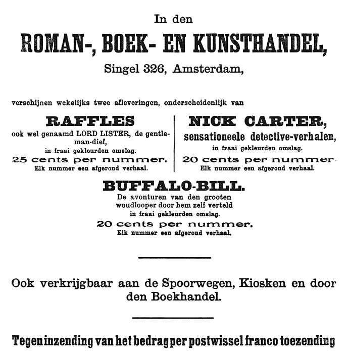 RAFFLES ook wel genaamd LORD LISTER, de gentleman-dief, in fraai gekleurden omslag. 25 cents per nummer. Elk nummer een afgerond verhaal. |