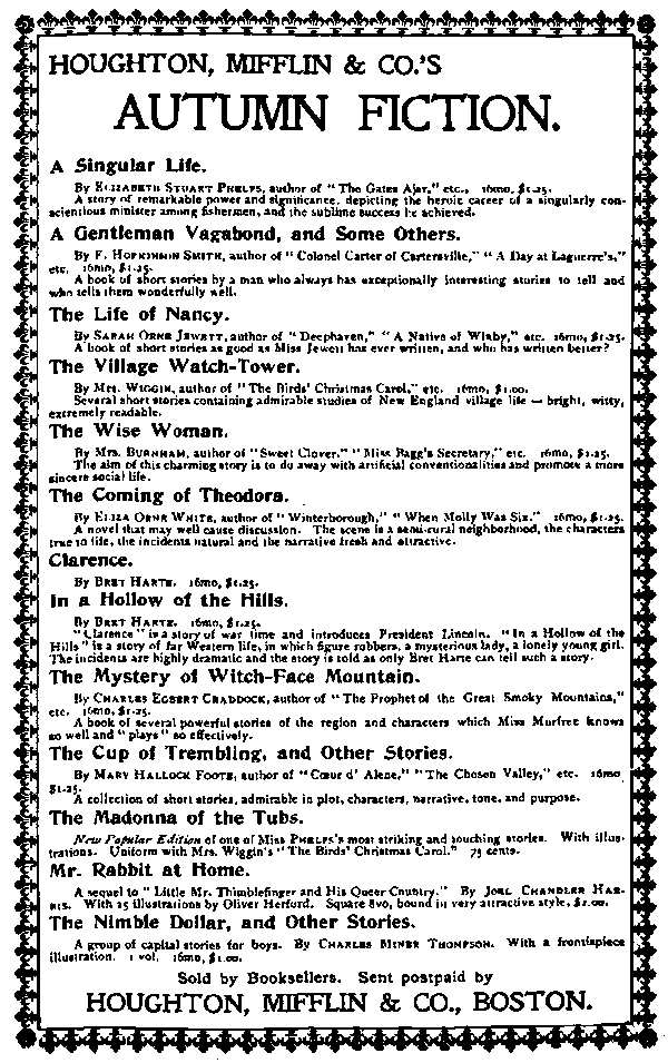 Several short stories containing admirable studies of New England village life—bright, witty, extremely readable.