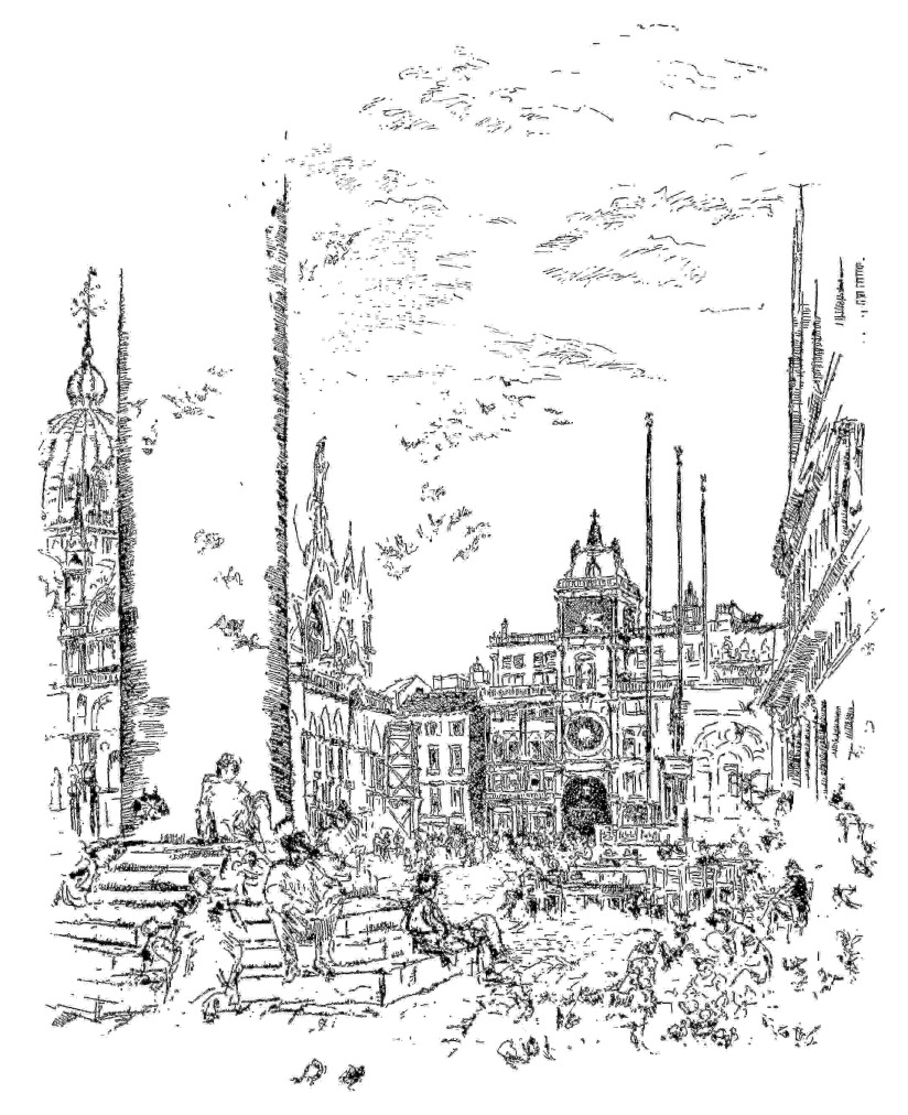 Since 1880, when they were first exhibited, many of the plates done in Venice have been taken up and perfected. The “Piazzetta,” for instance—unattractive at first: a ragged thing, or a skeleton—has somewhat lately been brought to the highest level that is attained by any etche art. And, several years ago, Mr. Whistler perfected for the limited issue by the Messrs. Dowdeswell, the “Twenty-six” plates—most of them Venetian in theme—which had, fortunately, been bought by hardly anybody (I may suppose) until, in 1886, their excellence was achieved. In this set, the entrancing freedom and inexhaustible suggestiveness of “The Balcony” and “The Garden” demand note: the balcony that, with drapery flung upon it, hangs over and overlooks the Grand Canal: the garden which passing humanity peers into, and peering, perhaps reflects with the Greek poet whose youth was gone: