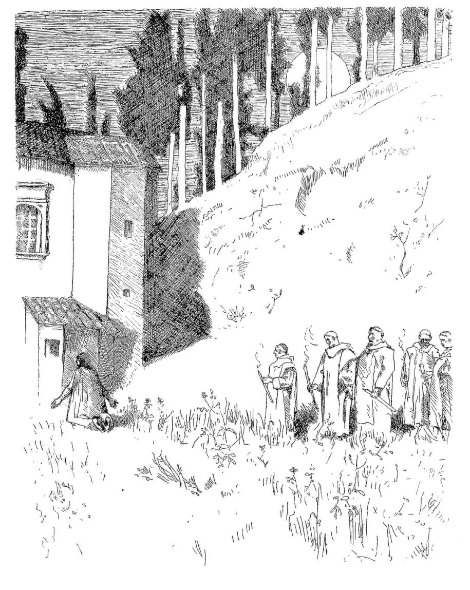 Several of the best of Mr. Holroy not yet very numerous prints—each one of which is well-considered, thorough and serious work—deal worthily, truly that is, and yet imaginatively, with the lives of ecclesiastics, among the cypresses and olive woods and pine-trees of Monte Oliveto, and in the gaunt and spacious chambers of the remote and hillside monastery, in which Mr. Holroyd,{88} with his love of Italy and of its graver life, was sometime minded to abide. Thus, in the Monte Oliveto series, we have the sombre yet pictorial incident of “Midnight Mass,” and, again, the “Ladies’ Guesthouse,” with its Tiepolo-like charm.