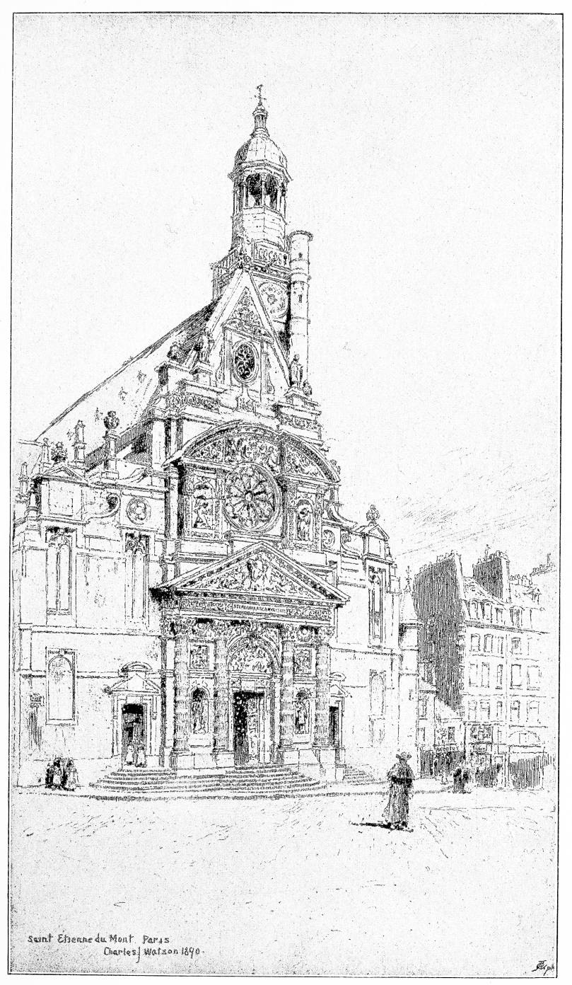 In simpler subjects than the “St. Etienne du Mont,” Mr. Watson shows as well as, or better, than there, a quality very characteristic of the truest of modern etchers—of Mr. Whistler and Mr. Short particularly—I mean, in what is more or less architectural draughtsmanship, after all, an enjoyment of the evidences of construction. Very likely it may be said that that is a quality belonging to him as a good draughtsman, whether, at the moment etching happens to be, or happens not to be, the medium of his work. I think not. There is something in the etched line that reveals especially the presence of this enjoyment—that calls for the certain display of it.{107}