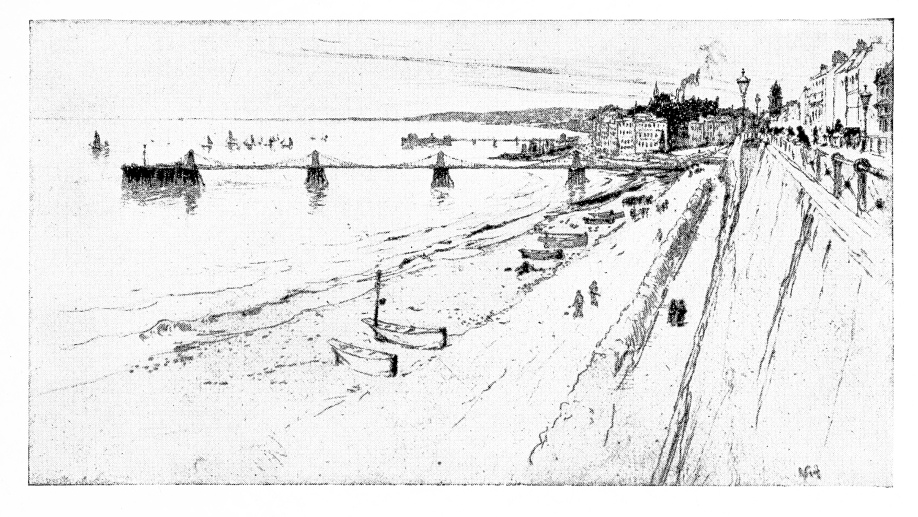 In “Winchester”—a little plate of great simplicity and reticence—there is the note of a mood and of an hour, as well as of a place. Behind the flat meadows and the nameless stream that small trees bend over, there is the long line of the cathedral; and one feels over all the quiet of Autumn. Not{126} a whit less admirable—a complete and satisfying picture, wrought with strength and delicacy—is “Pine Trees, Christchurch.” Then there is the peace of “Itchen Abbas Bridge”—the little dry-point with the mille house, the waving poplar, the granary, and the slow stream. In another plate, less personal, and perhaps less happy, but still good, there is the picturesqueness of the Lewes street; in the “Ford, Shoreham,” complex activity, fullness of theme. In the “South Cone,” the great broad waves that swing about the base of Brighton Pier, not only suggest the wind and moving waters that the title implies, but have a certain decorative quality, possible only when the process of “selection” has been just, and the visible labour somewhat sternly simplified. “The Chain Pier, Brighton,” combines in high degree the charms of elegance and mystery. See the foreshortening of the steep, high wall, the delicacy of the Chain Pier and little fleet of skiffs, the reticent, suggestive touch in those grouped houses by the “Albion.” “Charing Cross Bridge,” by reason of its subtle arrangement, its victory over difficult material—more even than the “Métropole,” with the dark cliff of masonry and the lighted lamps along the Brighton “front”—is perhaps the best of all the several plates which are deliberately devoted to the treatment of such things as{127}