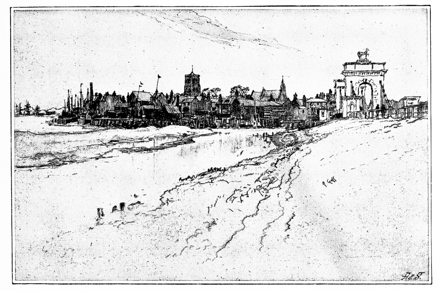 work not proceeding to a conscious elaboration, yet not stopping short of the point at which even for the many it may be expressive. Its quality, however, good as it is, does not really give it a unique place in the list of Gof labours; other plates—some that would be considered very humble ones—show virtues quite as valuable. Few etchers are Gof equals, fewer still go beyond him, in composition of line, in arrangement of light and shade; and as he firmly possesses this science, it is natural that very many of his plates, and not only one or two of them, should satisfactorily display it. “Norfolk Bridge, Shoreham”—of which a reproduction is given here—displays it delightfully. The unity of impression is complete; the grouping well-nigh faultless—there is the light arch of the bridge and the dark mass of clustered town behind it; church and houses and timbered sheds set amidst the winding of tidal waters; muddy shores, from above whose low sky-line there rises now and again the mast of a fishing-smack.