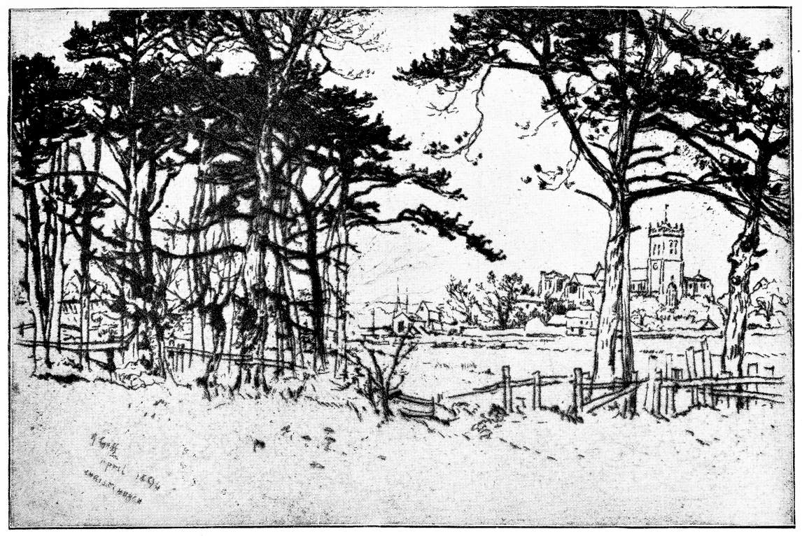 Again, there is Dr. Arthur Evershed, a ready and sensitive draughtsman with the needle, whose “Marsh Farm” is only one out of a score of evidences of his refined enjoyment of the quiet lines of uneventful lowland landscape. Sir Charles Robinson and Dr. Propert need by no means be forgotten. Mr. J. P. Heseltine has not perhaps exhibited much of late; but he, as long ago as when he wrought that series of Etchings Mrs. Noseda published—it was some twenty years since—gave ample proof{166} of his placid, sympathetic observation of the ordinary land, and of his ability to record the charm he was not tardy in feeling. The etched work of Mr. Holmes May is, most of it, I think, more recent. It is a vigorous, independent sketching of landscape. It notes tree-form with energy and sky effects with refinement.