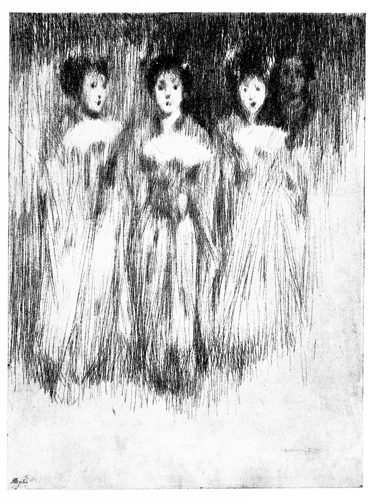 Hardly any of Legro work is dated, and, as time has passed, the changes in his method have not been very marked, though it is hardly to the earliest etching that we must go for his most trained draughtsmanship and most accomplished technique. On the other hand, the early work has about it a sometimes savage earnestness, a rapid and immediate expressiveness, a weirdness also, which are immensely impressive. Poetic and pathetic is it besides, sometimes to the last degree. “Les Chantres Espagnols,” for example, is the creation of a great artist: a most penetrating and pathetic study of physical and mental decay. It represents eight priestly singing men lifting up what hoarse and feeble voices they may be possessed of, in the hushed choir, by the uncertain light of torches, in the nigh most mysterious and most ominous hour.