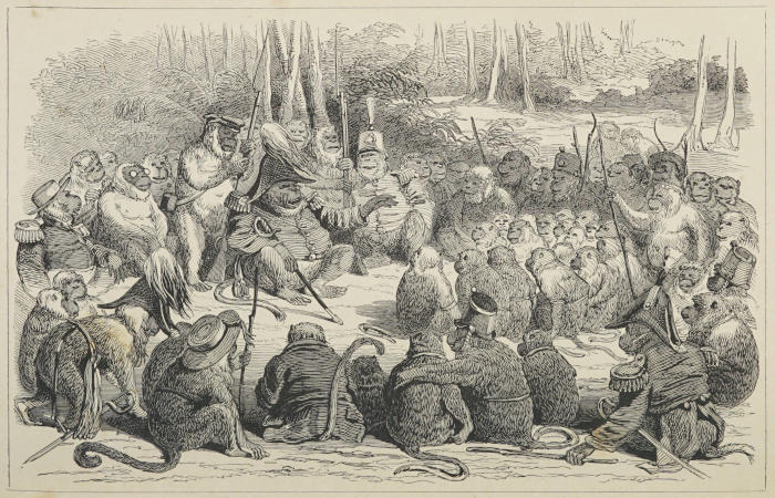 I had pushed my observations so far on those particular beings with whom it is now-a-days maintained we have a certain affinity, that I could easily recognise among them those whose instinctive dispositions corresponded in a measure with our own, and who would have become, for example, barristers, if any such profession as that of the Bar existed amongst apes, for they were always gesticulating, haranguing, and arguing. I recognised again such as would have been doctors, among those who were continually occupying themselves with the physical condition of their fellows, examining their tongues, their throats, and the inside of their eyes; others who would certainly have become comedians, for they were perpetually making grimaces, and playing and dancing from morning to night; others again who would have made first-rate astronomers, for they invariably arranged themselves so as to have the sun always shining on the tips of their noses. I recognised, moreover, with a similar infallibility, those who possessed a taste for commerce, apes who made a point of collecting together all the fruit and corn which fell from the[14] negligent hands of their fellows, and of piling it up in a corner. In like manner I distinguished the misers, the spendthrifts, the madcaps, the bullies, the good fathers and mothers, the mothers given to flirting, and the incorrigibly bad sons; and particularly thieves of every shade, from the sharper moving in good society, who cheats at the card-table, to the more daring robber who takes to the highway. I should have said of the one, “Here is an ape who would loll in his carriage if he had only a white cravat;” of the other, that “he would be safe to be hung if he only happened to wear a coat.”