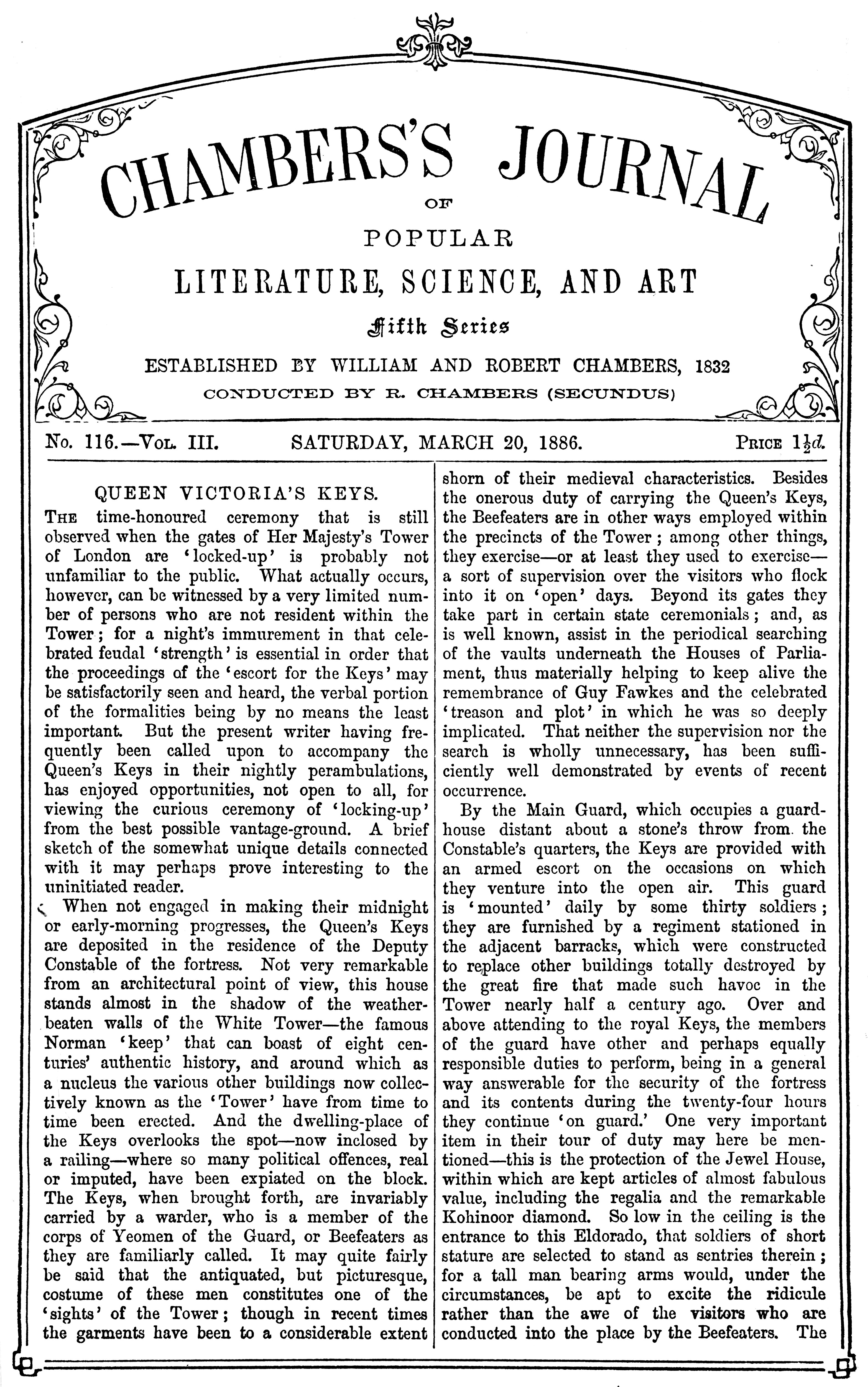 The time-honoured ceremony that is still observed when the gates of Her Majesty’s Tower of London are ‘locked-up’ is probably not unfamiliar to the public. What actually occurs, however, can be witnessed by a very limited number of persons who are not resident within the Tower; for a night’s immurement in that celebrated feudal ‘strength’ is essential in order that the proceedings of the ‘escort for the Keys’ may be satisfactorily seen and heard, the verbal portion of the formalities being by no means the least important. But the present writer having frequently been called upon to accompany the Queen’s Keys in their nightly perambulations, has enjoyed opportunities, not open to all, for viewing the curious ceremony of ‘locking-up’ from the best possible vantage-ground. A brief sketch of the somewhat unique details connected with it may perhaps prove interesting to the uninitiated reader.
